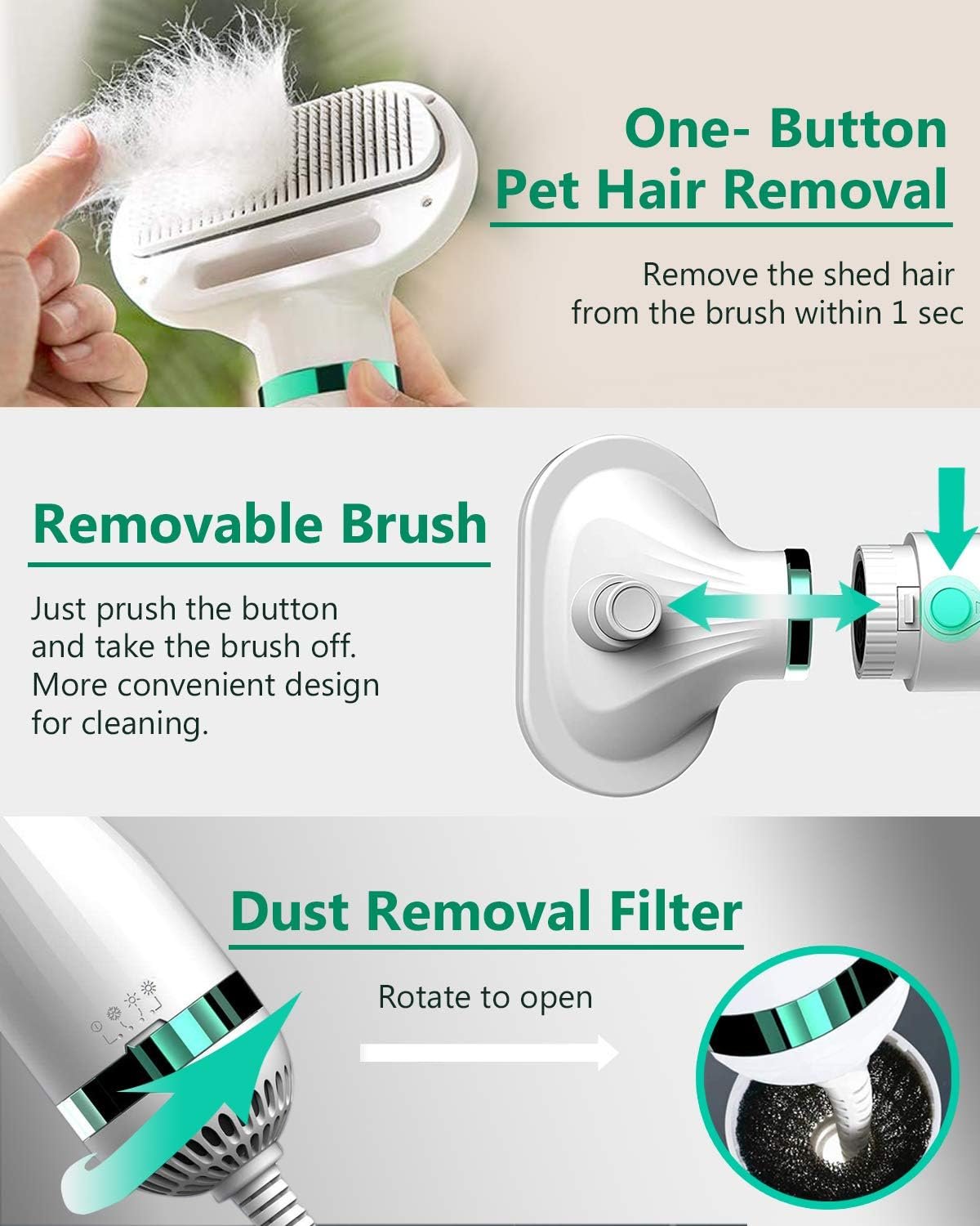 [ONE-BUTTON PET HAIR REMOVAL]: More convenient for you to clean the pet hair dryer, more efficient for you to clean what the pet’s fur fall off and block the hair dryer. Just push one-click hair removal, it will easily clear it.