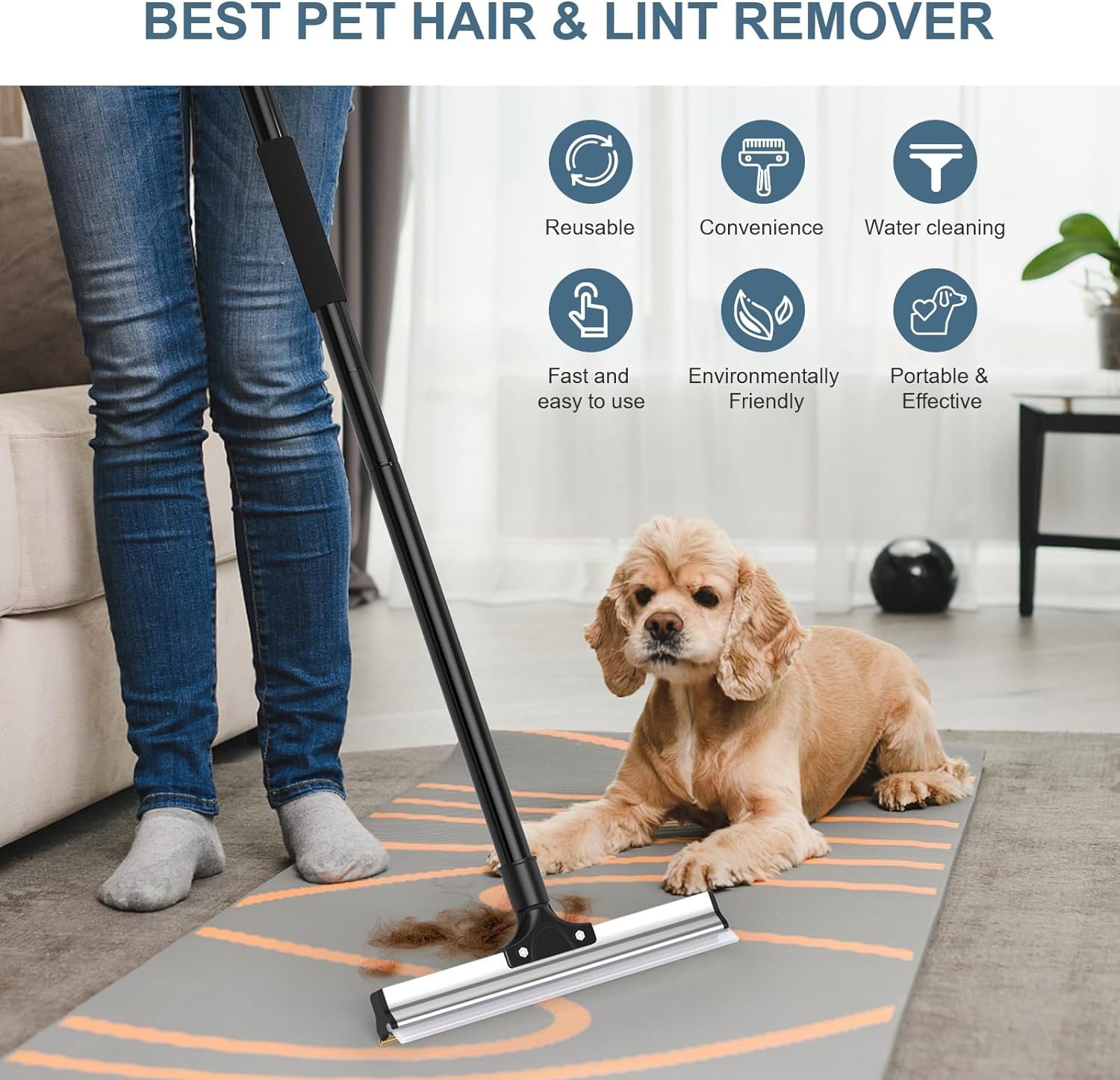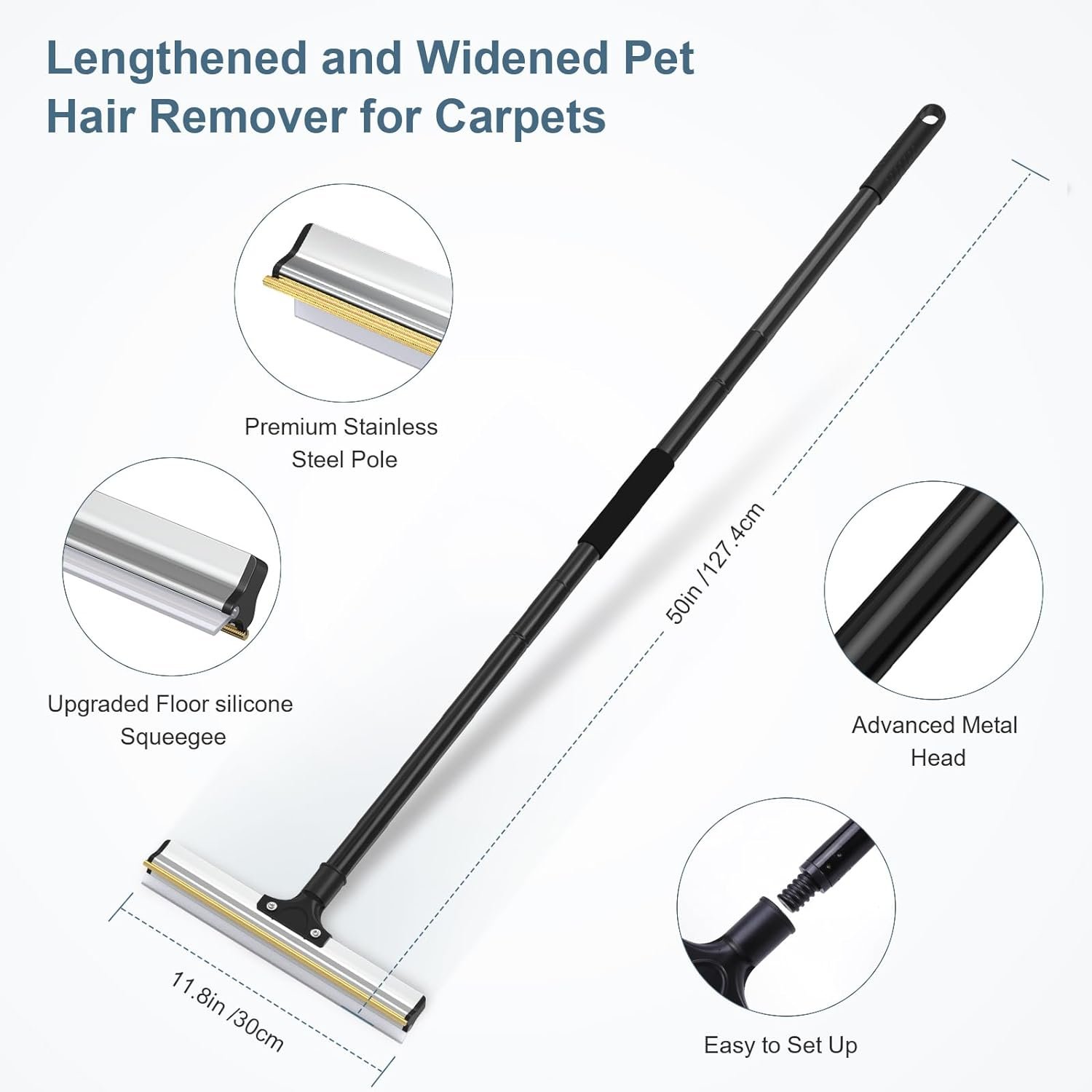 Adjustable Telescopic Handle: With this dog cat hair remover, Enjoy the ultra-sturdy removable handle made of three sections of alloy material that ensures durability and ease of use. The thickened wall prevents bending, and the length can be adjusted from 48cm to 90cm or 127cm. This function can meet the needs of different cleaning locations, and there is no need to bend over or squat during cleaning tasks.