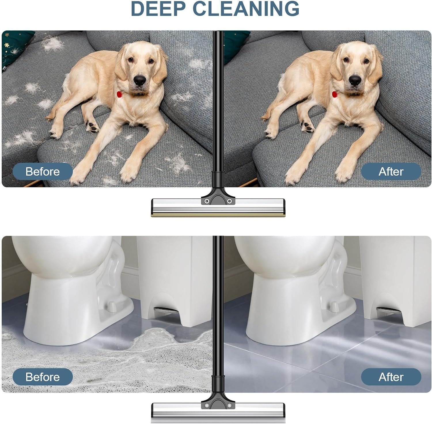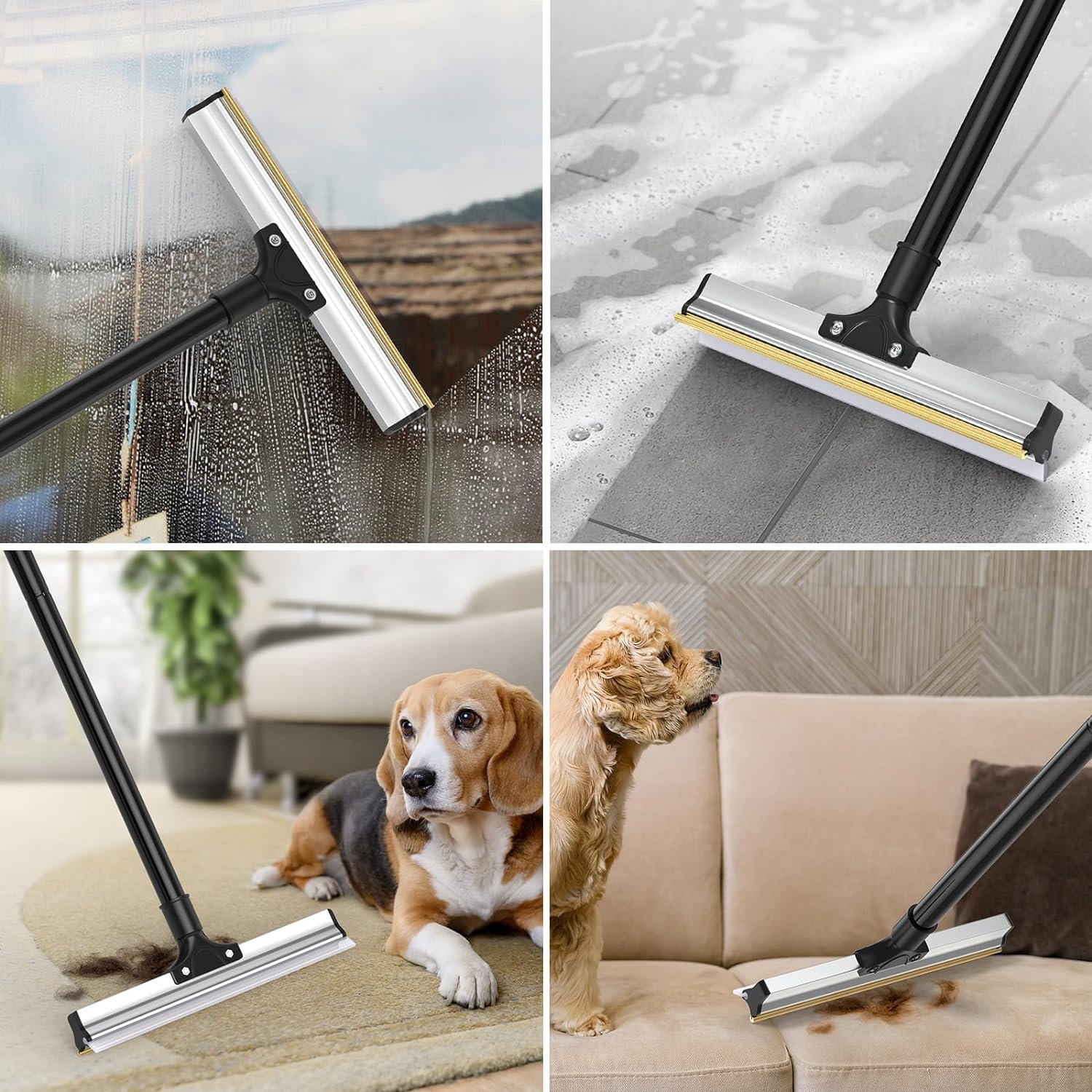 Both Wet and Dry with Cleaning Brush: This dual-purpose pet hair remover is designed for wet and dry use. The metal scraper is ideal for sofas, carpets, and fabric seats, while the silicone scraper strip is perfect for scrubbing water damage on smooth floors, hardwoods, tiled surfaces in garages and bathrooms, pool decks, windows, car windows, glass shower doors, and kitchen surfaces. The equipped cleaning brush allows you to effortlessly clean the hair on the broom without getting your hands dirty.