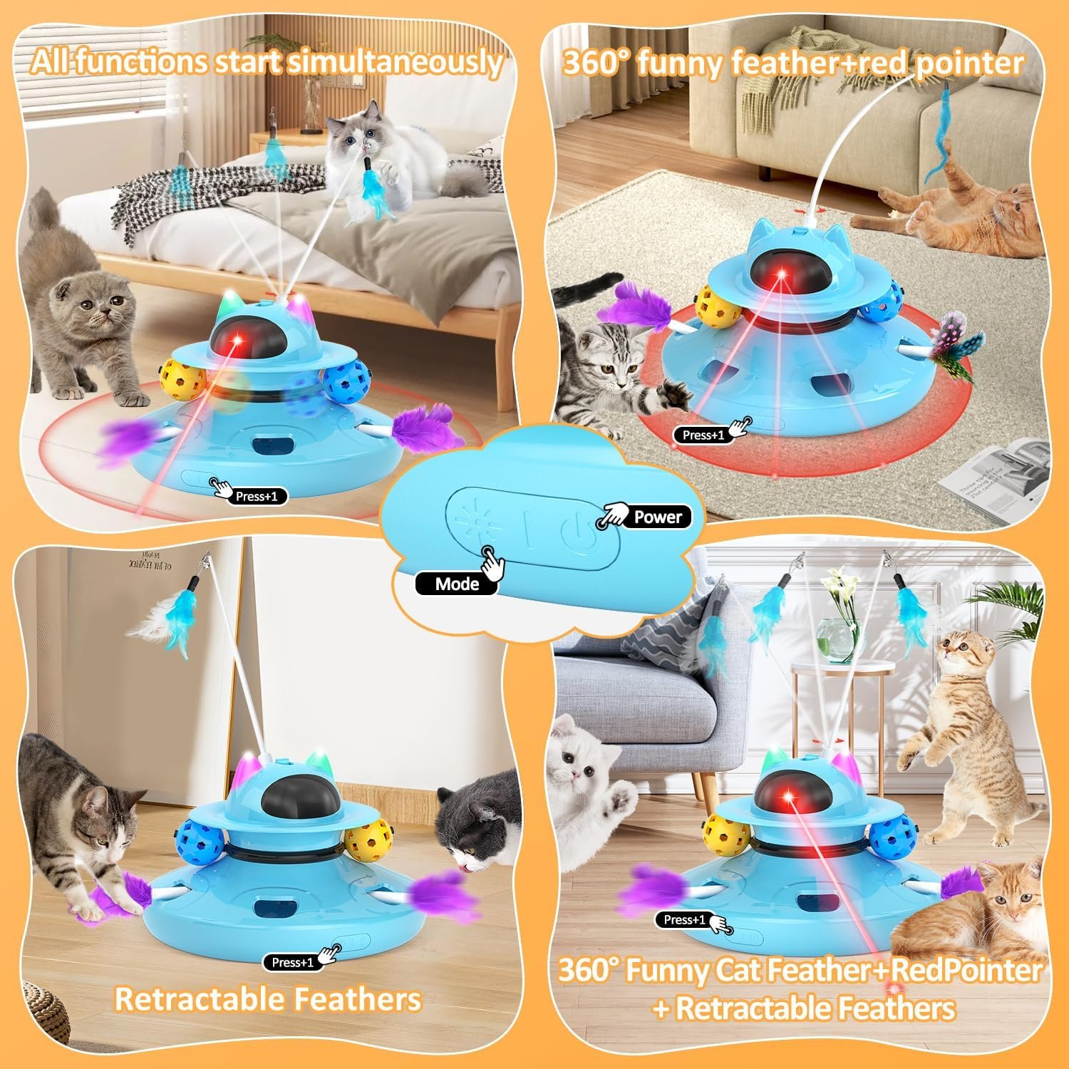 🐾【𝟒-𝐢𝐧-𝟏 𝐢𝐧𝐭𝐞𝐫𝐚𝐜𝐭𝐢𝐯𝐞 𝐂𝐚𝐭 𝐓𝐨𝐲𝐬】Unleash your cat’s vigor and hunting instincts with our automatic cat toys for indoor cats, perfect for multi-cat households. A fluttering feathers, random feather ambush from six holes, a captivating 360° rotating cat laser toy automatic, and a trackball game engage your cat in exciting, instinct-driven play.