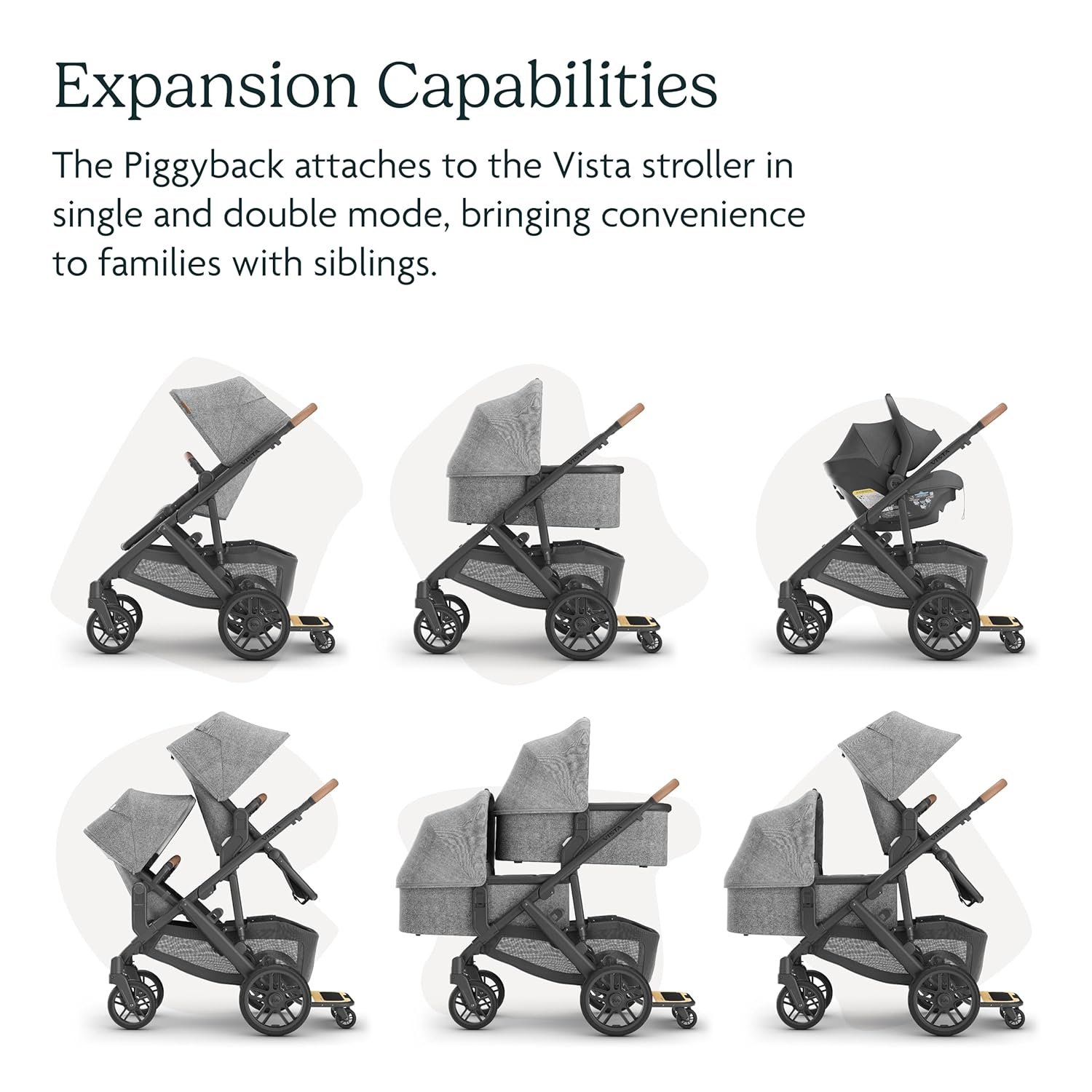 The PiggyBack ride along board easily attaches to the back of your VISTA stroller to allow your toddler to join in the stroll, even when they are too tired to walk on their own. Weight limit: 55 lbs Quick snap on and off attachment Conveniently lifts out of the way when not in use Stroller can fold with PiggyBack attached Made with natural, eco-friendly wood Non-skid surface prevents slipping Compatible with VISTA 2015+, and VISTA V2