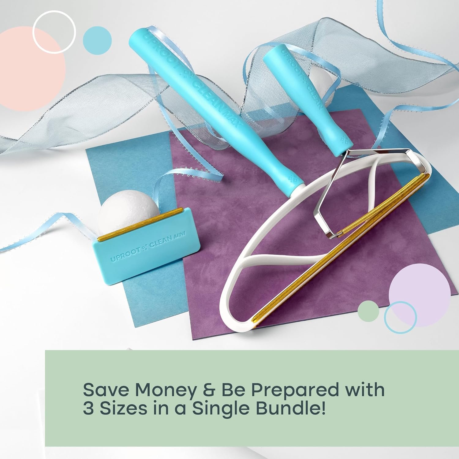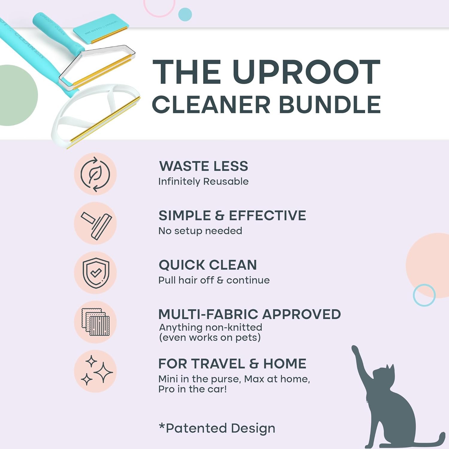 EMBEDDED HAIRS NO MORE – The uproot lint tool bundle saves you time & energy. Use the Mini as pet hair remover for car, the Pro as pet hair remover for couch, and the Max as carpet scraper for pet hair. Each lint remover for pet hair reaches even the most attached follicles, dust & lint easily.