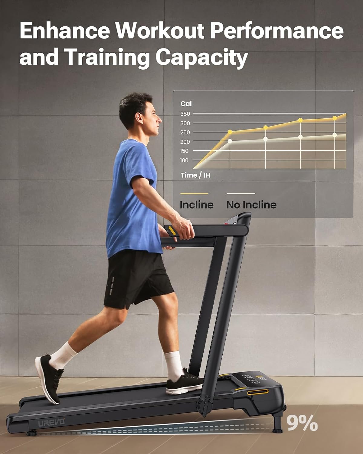 UREVO Treadmill with Incline: It is not only a 2 in 1 under desk treadmill, but also comes with 5-9% 3-level incline selection, 1 button automatic adjustment. You can choose the mode that works best for a more productive workout.