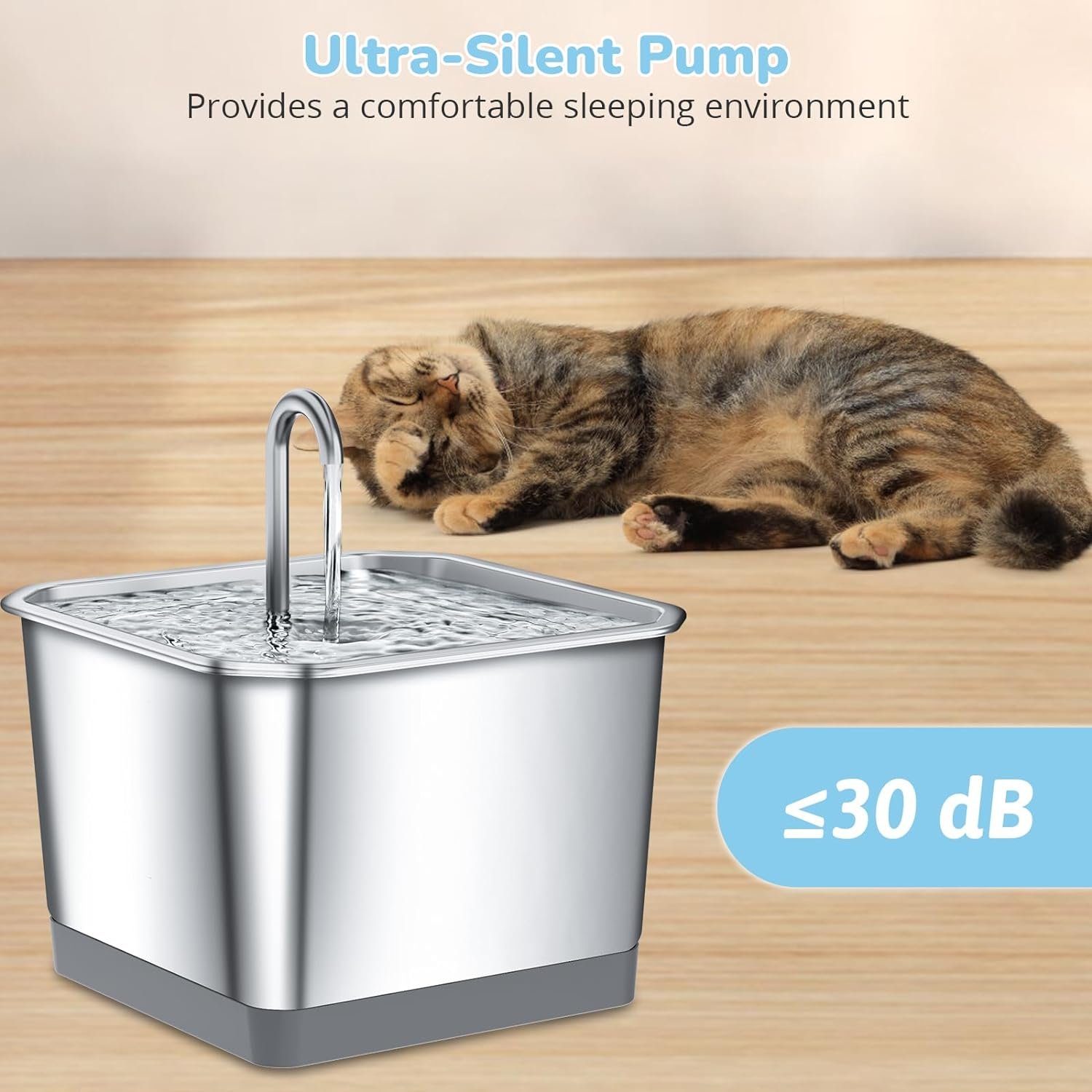 5V Ultra-Silent Pump: The water pump of the cat fountain runs ultra-quietly ≤30dB. It allows your furry friends drink and sleep in peace. When the water level is lower than the minimum level, the water pump will stop working to prevent the damage of pump.
