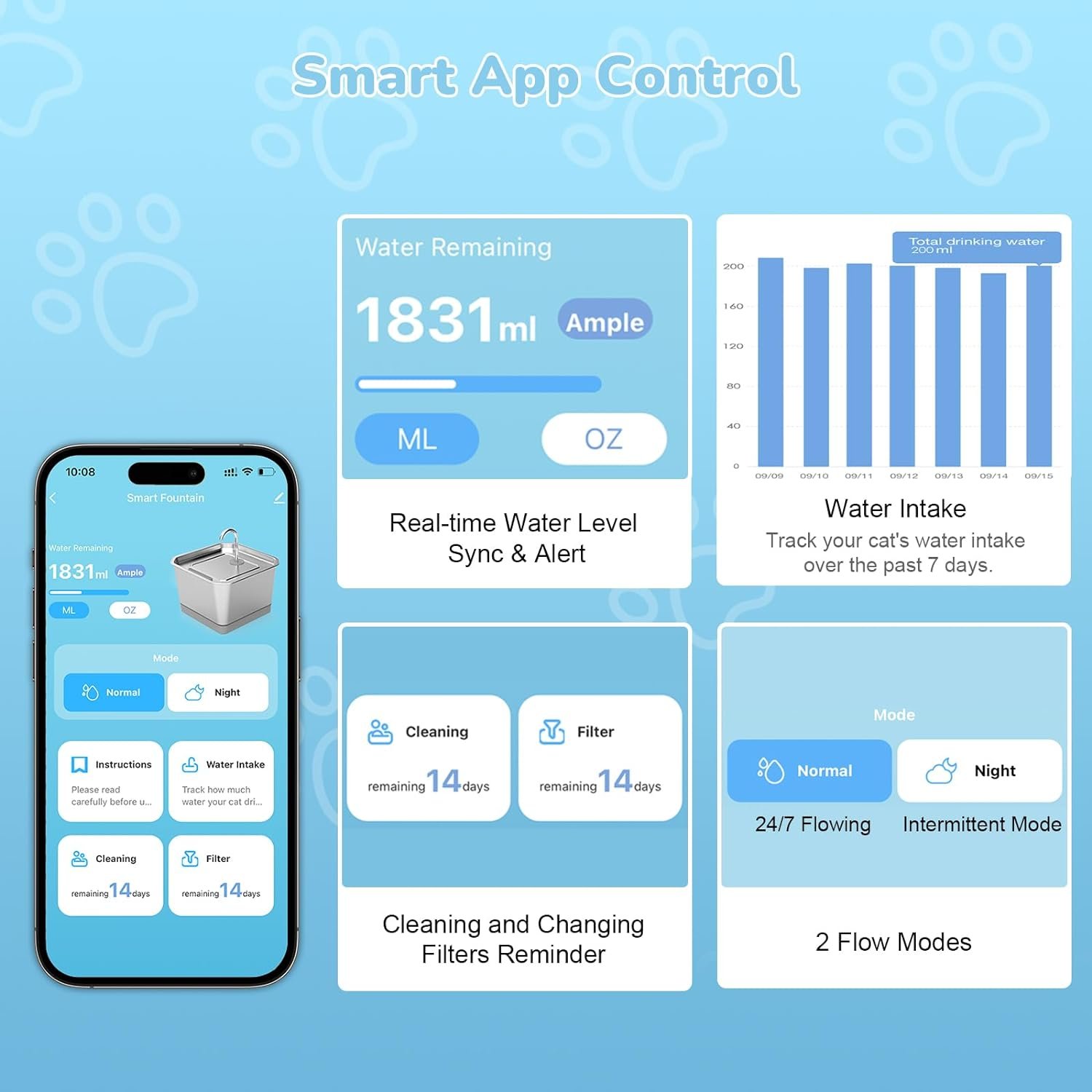 Smart App Reminders: The App controlled cat fountain features real-time water level sync and low water level alerts. With in-app reminders, you will never forget to change filters and clean the pet water dispenser. The cat water fountain provides your cat with clean and fresh water every day, which helps keep your cat healthy and hydrated. (Note: The device only supports 2.4GHz WiFi network. )
