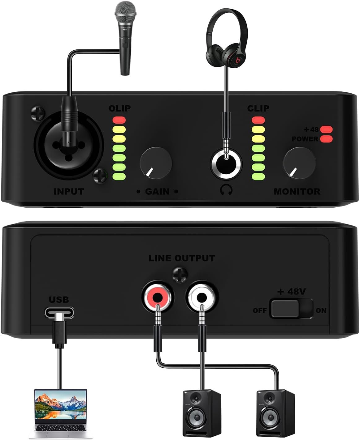 【Versatile】USB audio interface is a highly rated and popular product, which provides a simple and effective way to connect your computer to professional audio equipment. It is designed for musicians, podcasters, and recording artists who need a reliable and high-quality audio interface to record their music or podcasts.