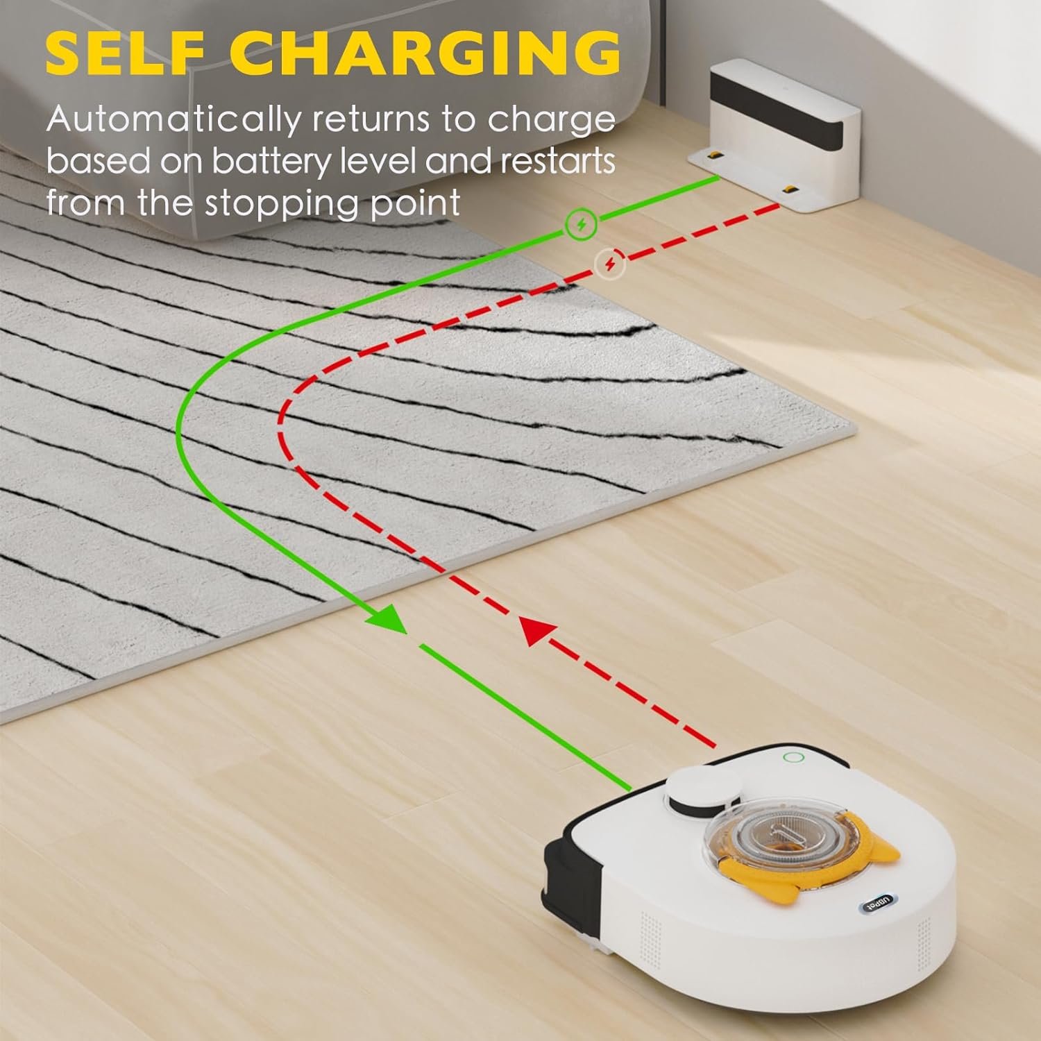 [Deep Cleaning for Floor, Carpet ] Effortlessly navigating a variety of floor and carpets. effortlessly collects pet hair, coffee grounds, oats, chocolate chips, and mixed waste from a variety of surfaces, leaving no room for dirt or debris to escape its thorough cleaning. And UBPet V10 auto robot vacuum excels in cleaning on carpet heights under 0.7″. Including short and medium-pile ones. For a more thorough cleaning of your carpet, you can turn on the Carpet Boost mode.