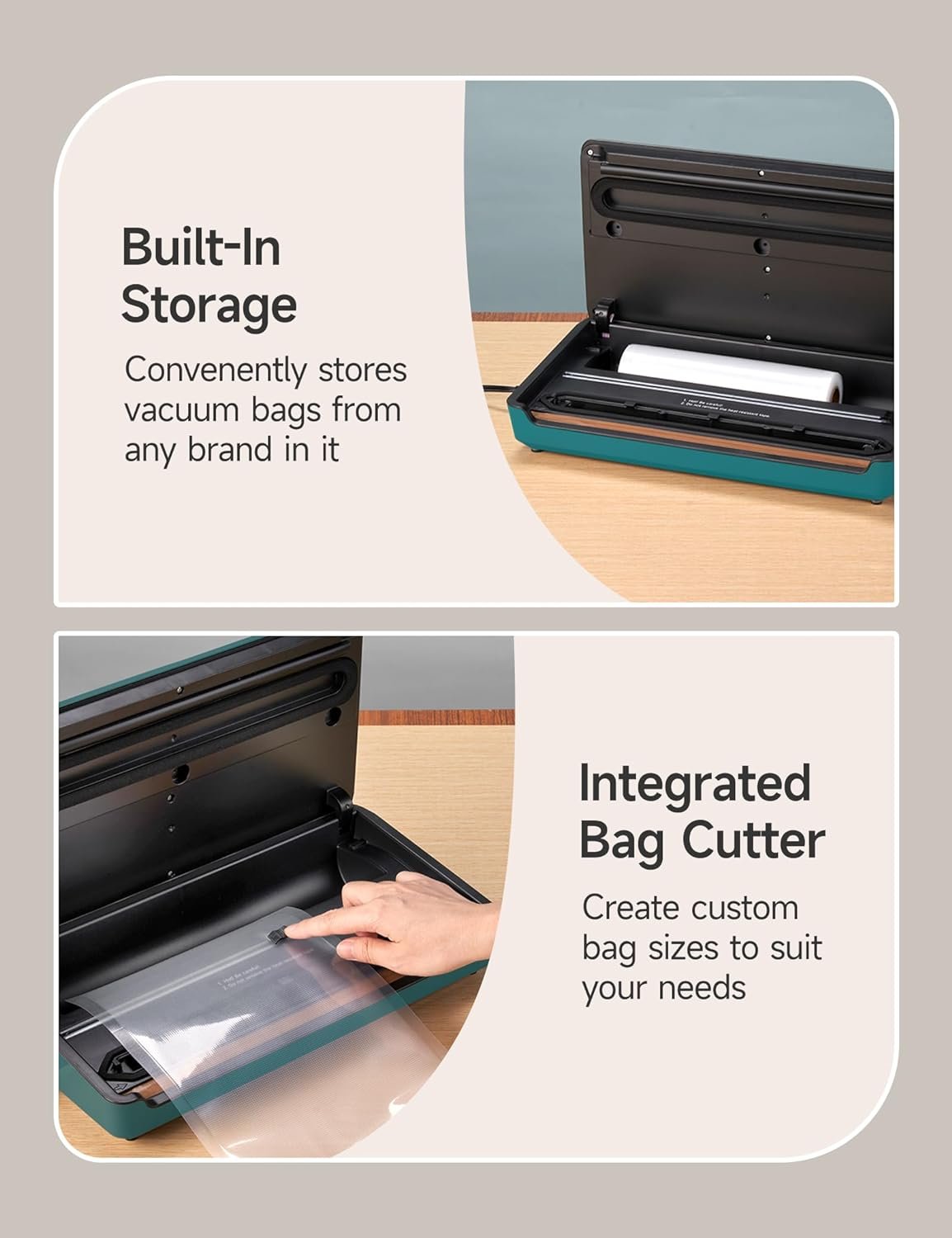 Integrated Bag Cutter & Storage: The independent vacuum bag storage makes this vacuum sealer machine easy to stock bags and avoid contamination, while the integrated bag cutter of this vacuum sealer delivers precise cuts to reduce waste.