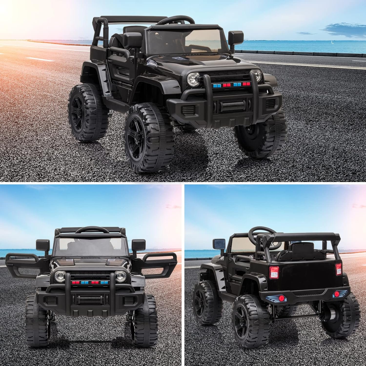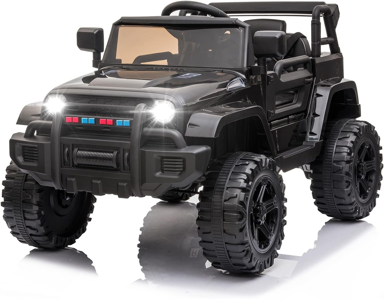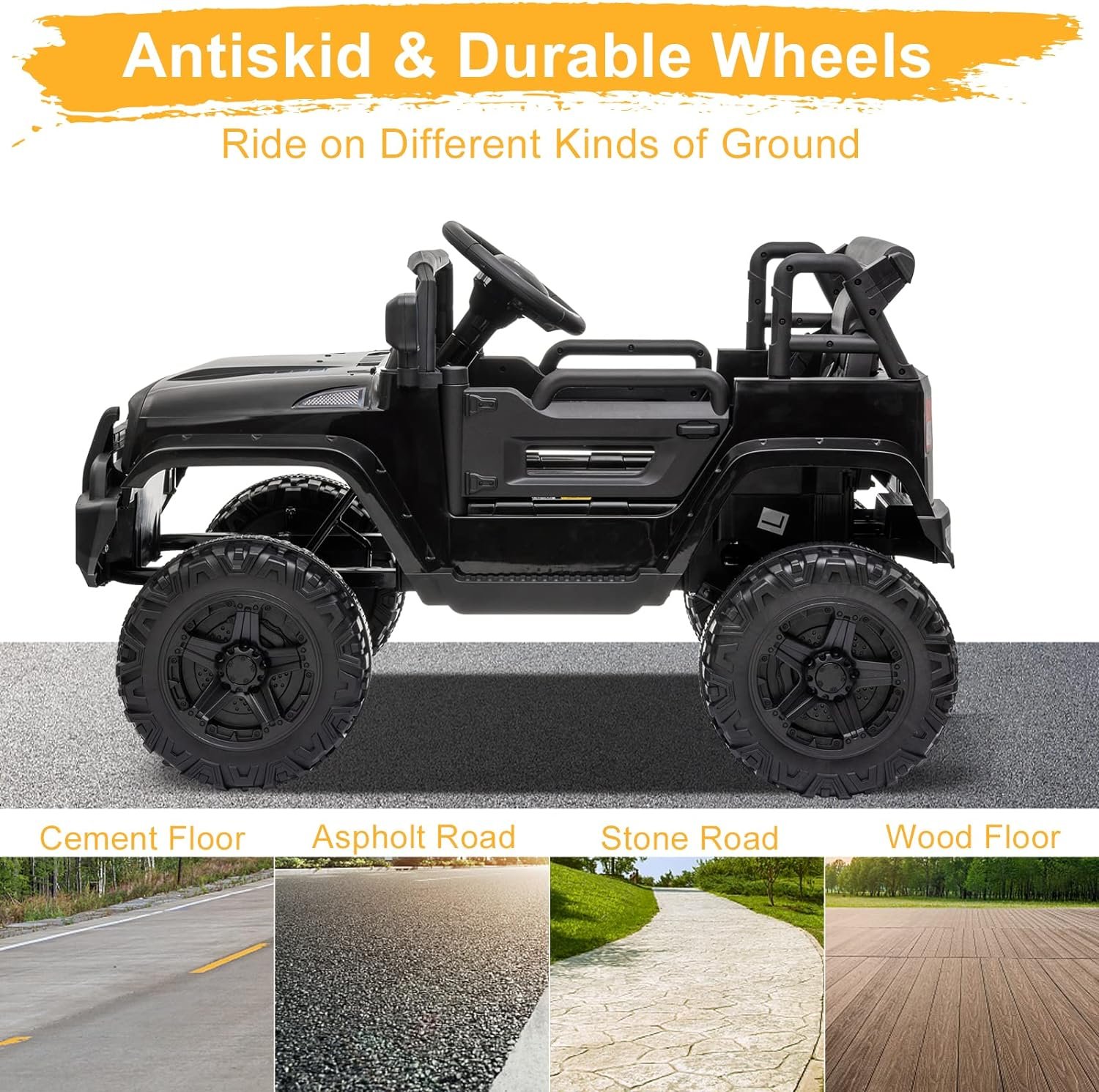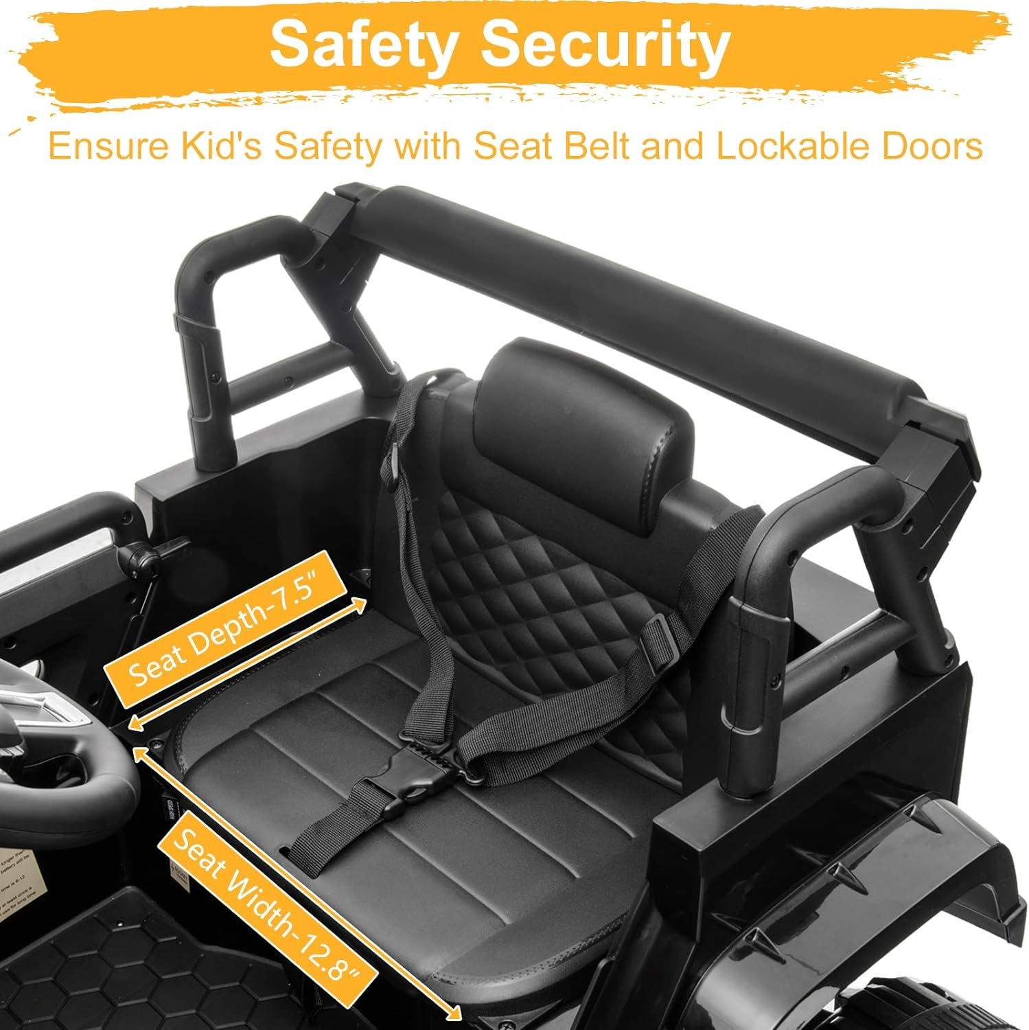[SAFE DRIVING] – ASTM-certified. Our kid’s truck is designed with a 12.8″ width seat with adjustable seat belts, 4 powerful wheels with spring suspension create a smooth ride, these both will ensure the children’s safety meanwhile a comfy experience