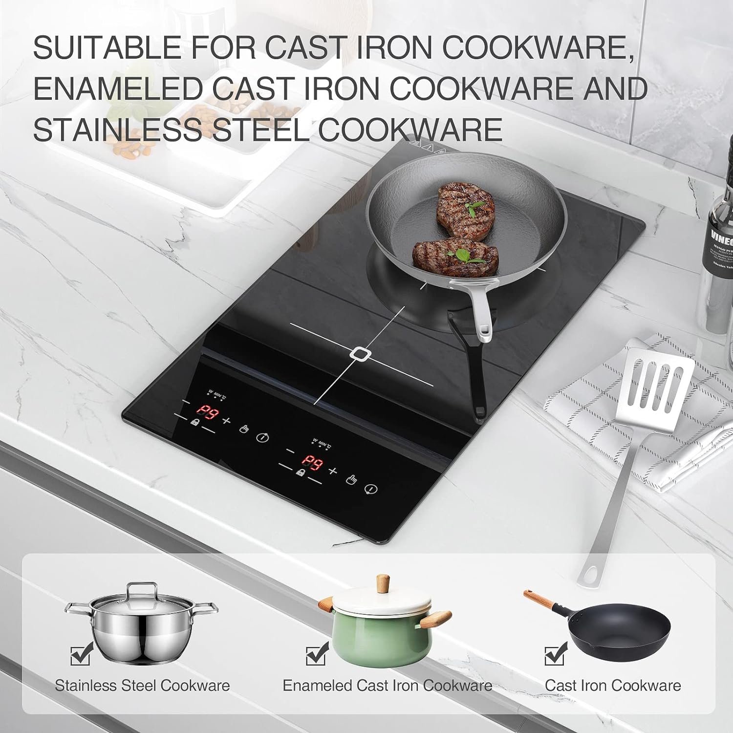 【9 Power Levels】VBGK sensor touch control electric cooktop has 9 power levels. Electric cooktop perfect for braise, fry, simmer, steaming, boil, stir-frying, roast. induction cooktop perfect for flat bottomed magnetic pots.