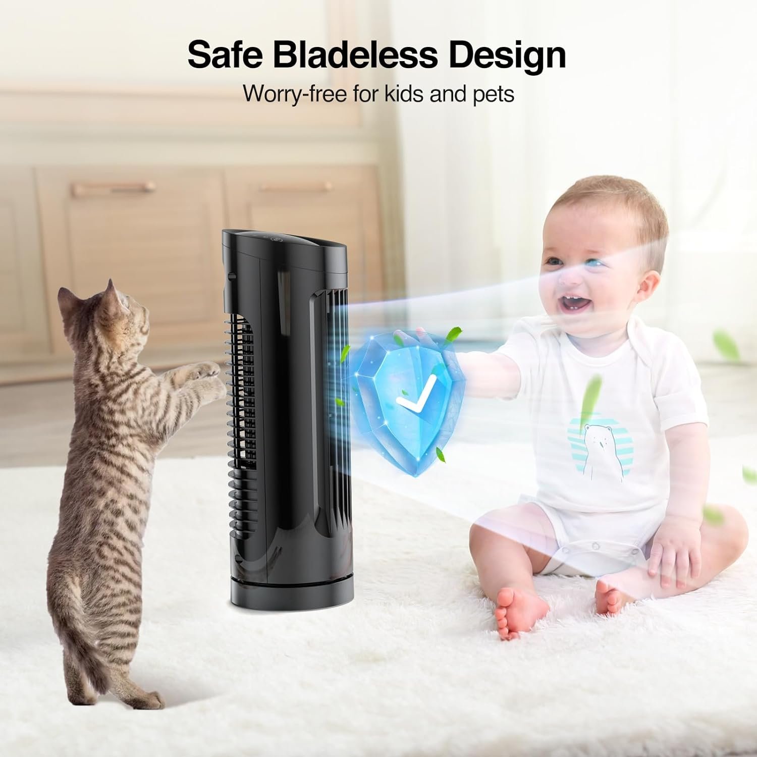 【Safe Bladeless Design】Experience peace of mind with our 13-inch desktop tower fan’s innovative bladeless design, making it safe for children and pets.