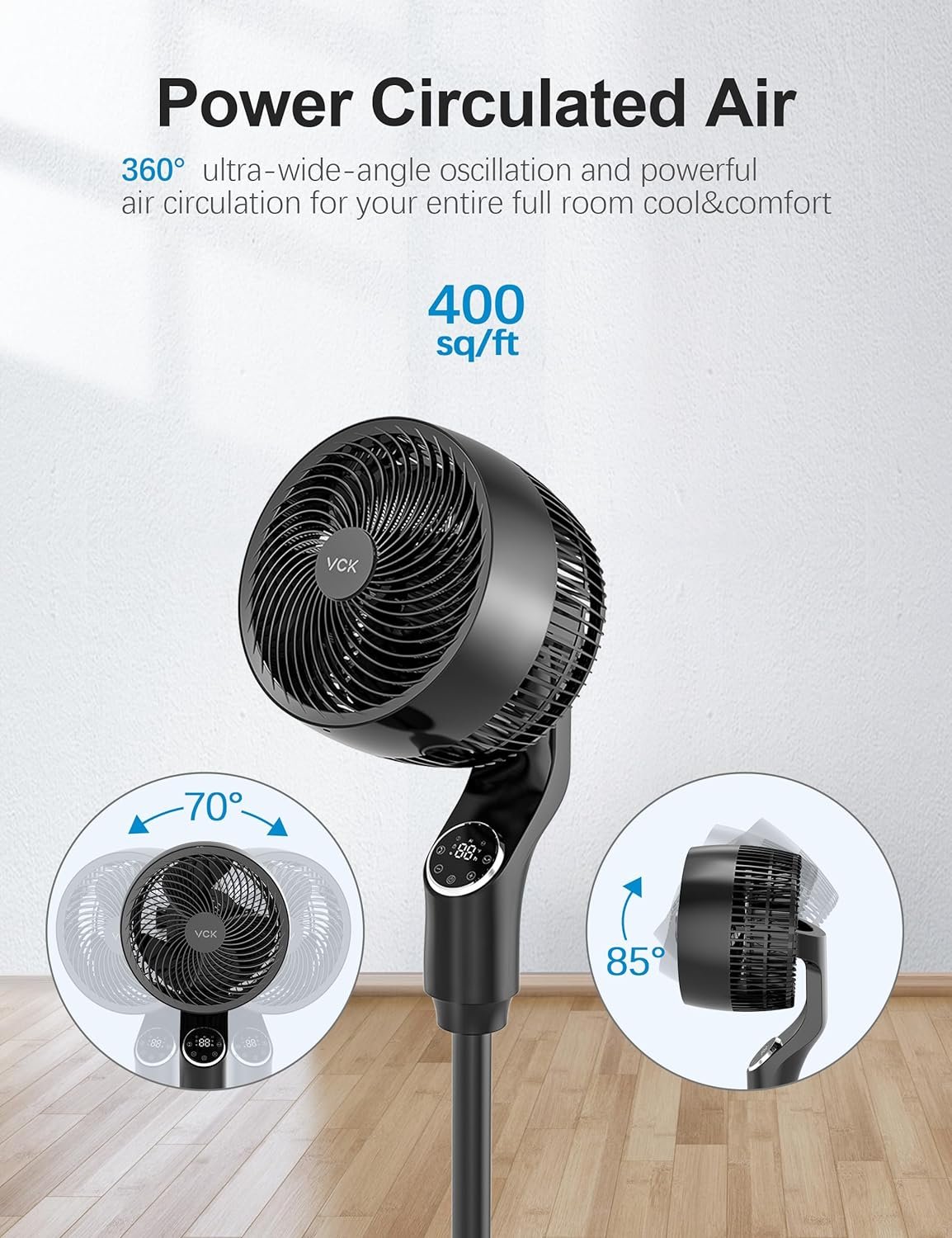 Powerful Windp & Omni-directional Oscillation: Experience unparalleled air circulation with this standing fan. Its 85° vertical and 70° horizontal oscillation distributes air more efficiently throughout your entire room, allowing you to share the freshness your family and friends. With 3 high-quality blades and a strong motor, this VCK oscillation fan could provide strong wind to boost the cooling effect when using with air conditioner