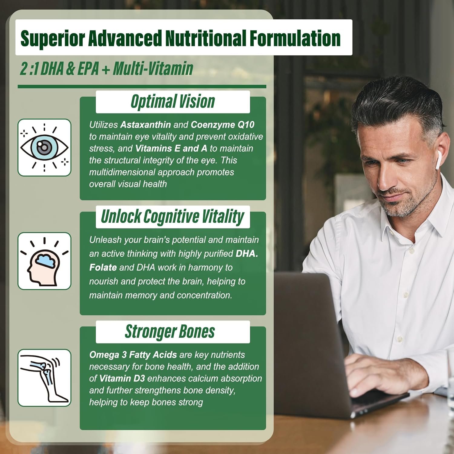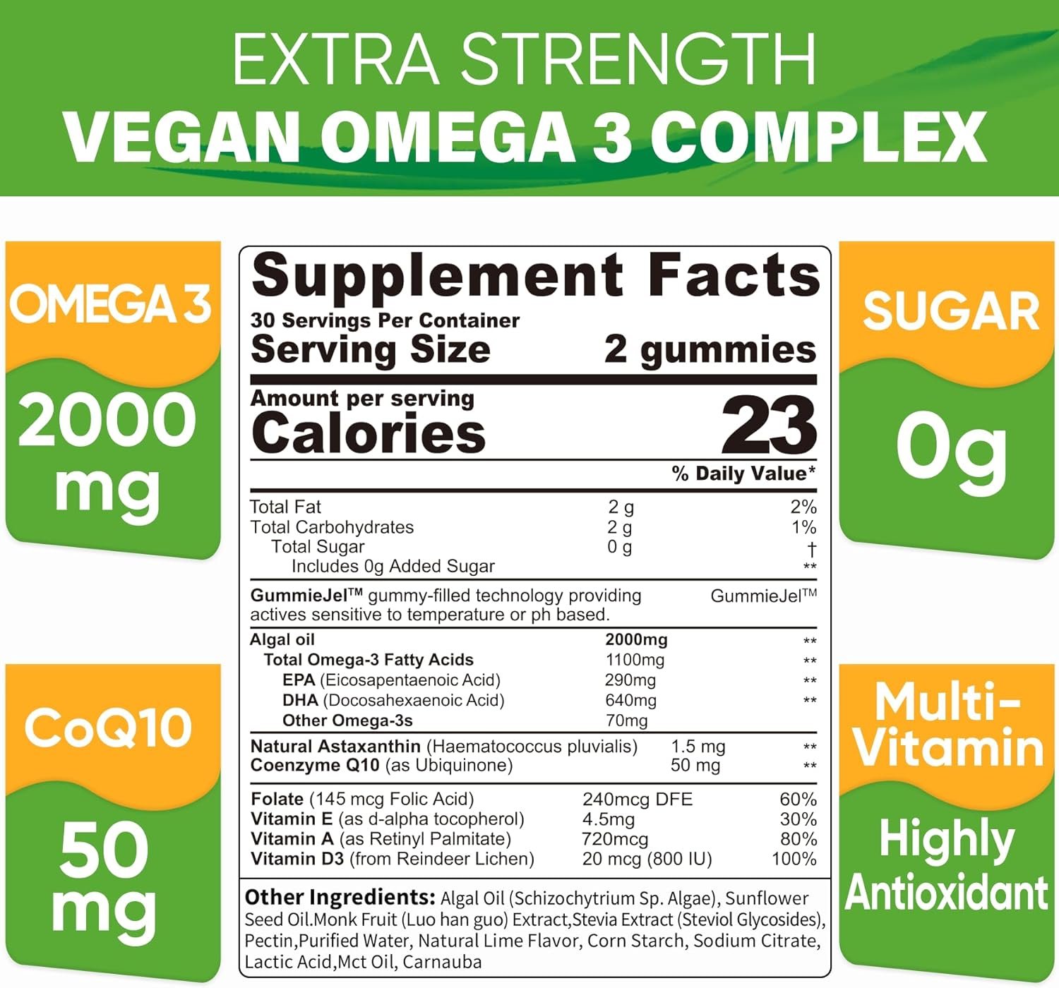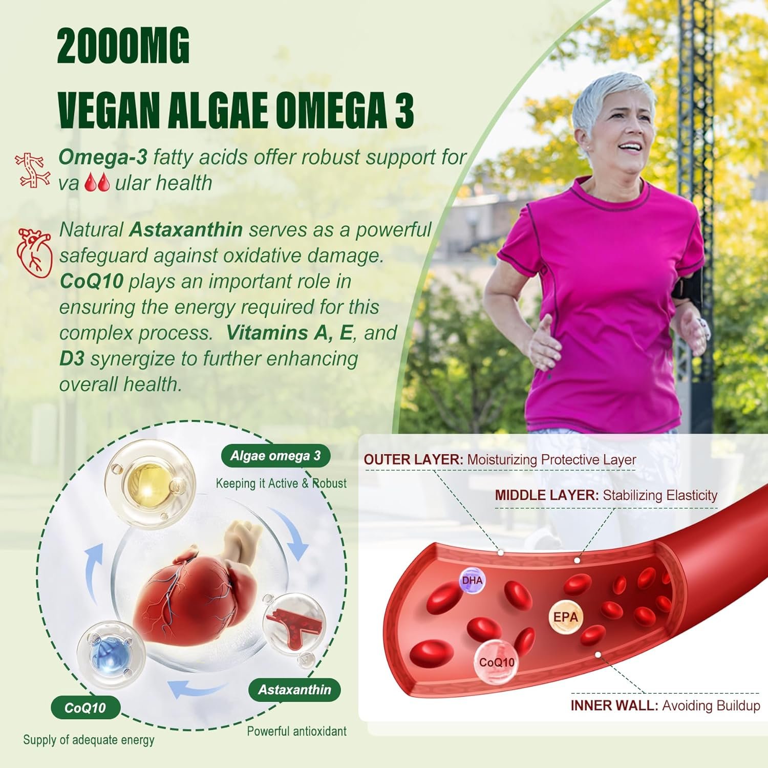 VITALITY AND PROTECTION: Natural vegan algae oil omega 3 has a 30% higher absorption rate than traditional fish oil and Balanced Plant-Based 2:1 DHA & EPA , which in combination with COQ10 interacts Helps to deeply nourish the core of your life’s sustenance.Natural forms of triglycerides are more easily absorbed and maintain overall energy levels.Astaxanthin extracted from microalga haematococcus pluvialis, acts as a potent antioxidant, protecting cells,Enhances physical vitality.