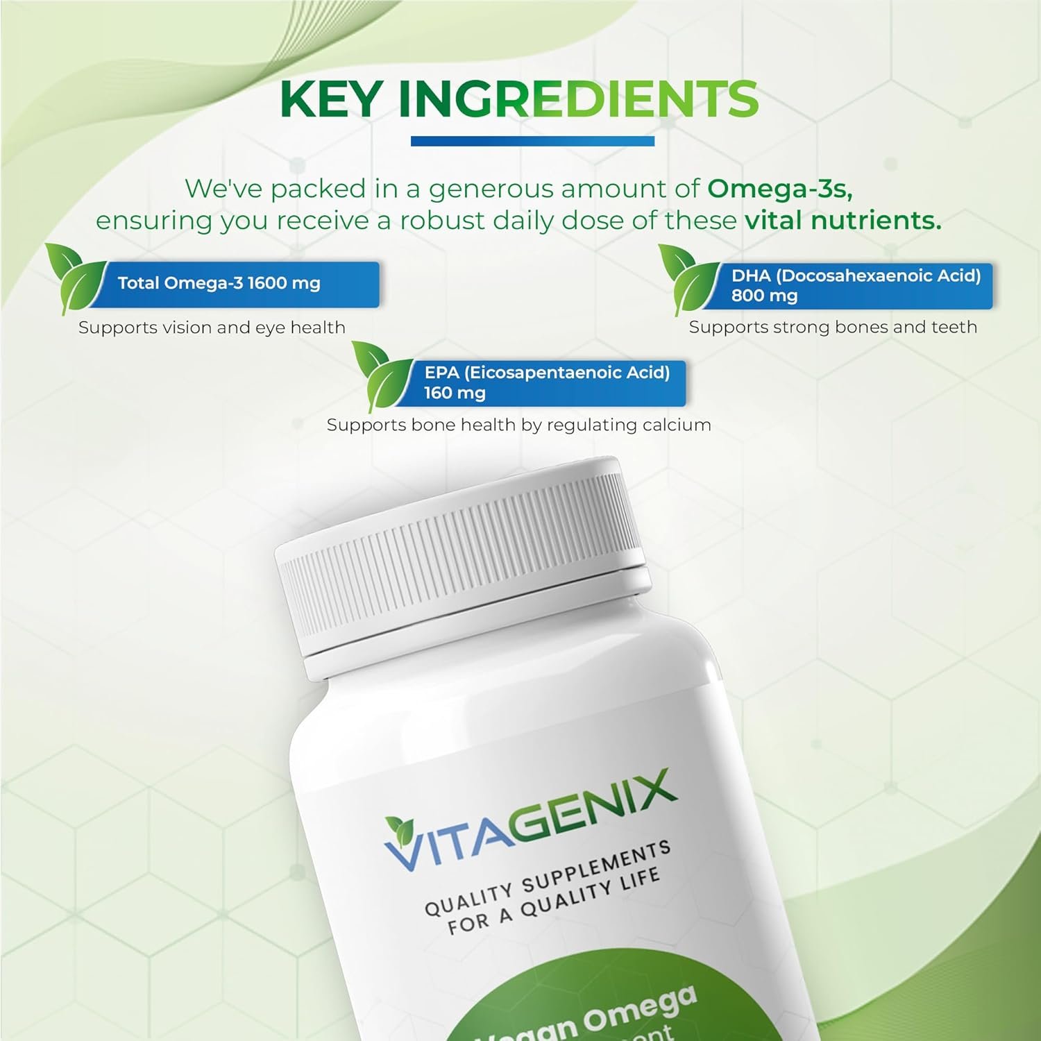 Free from harmful additives: Our vegan omega-3 supplement is free from binders, fillers, preservatives, gluten, wheat, yeast, milk, lactose, soy, artificial colors, flavors, or sweeteners. Experience the natural goodness of omega-3 fatty acids without any unwanted additives.