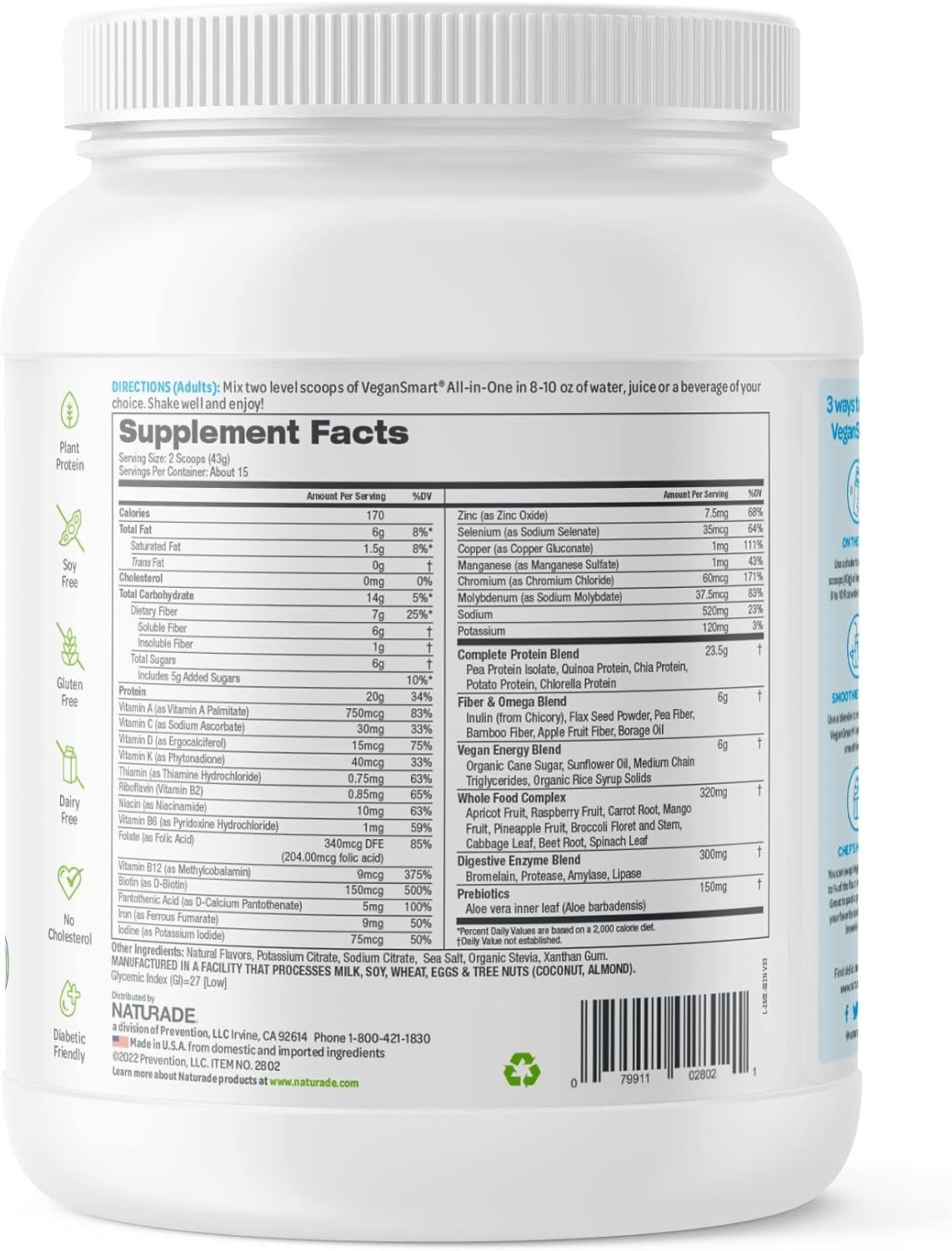 All-IN-ONE NUTRITION: Naturade Vegansmart vegan protein powder is a nutritional solution that goes beyond protein. It’s a low-calorie, all-in-one shake packed with essential vitamins, minerals, and prebiotics for digestion and overall wellness. With added dietary fiber, an Omega blend, and a spectrum of 23 vitamins and minerals, this convenient all-in-one shake provides comprehensive nourishment for your body’s diverse needs.