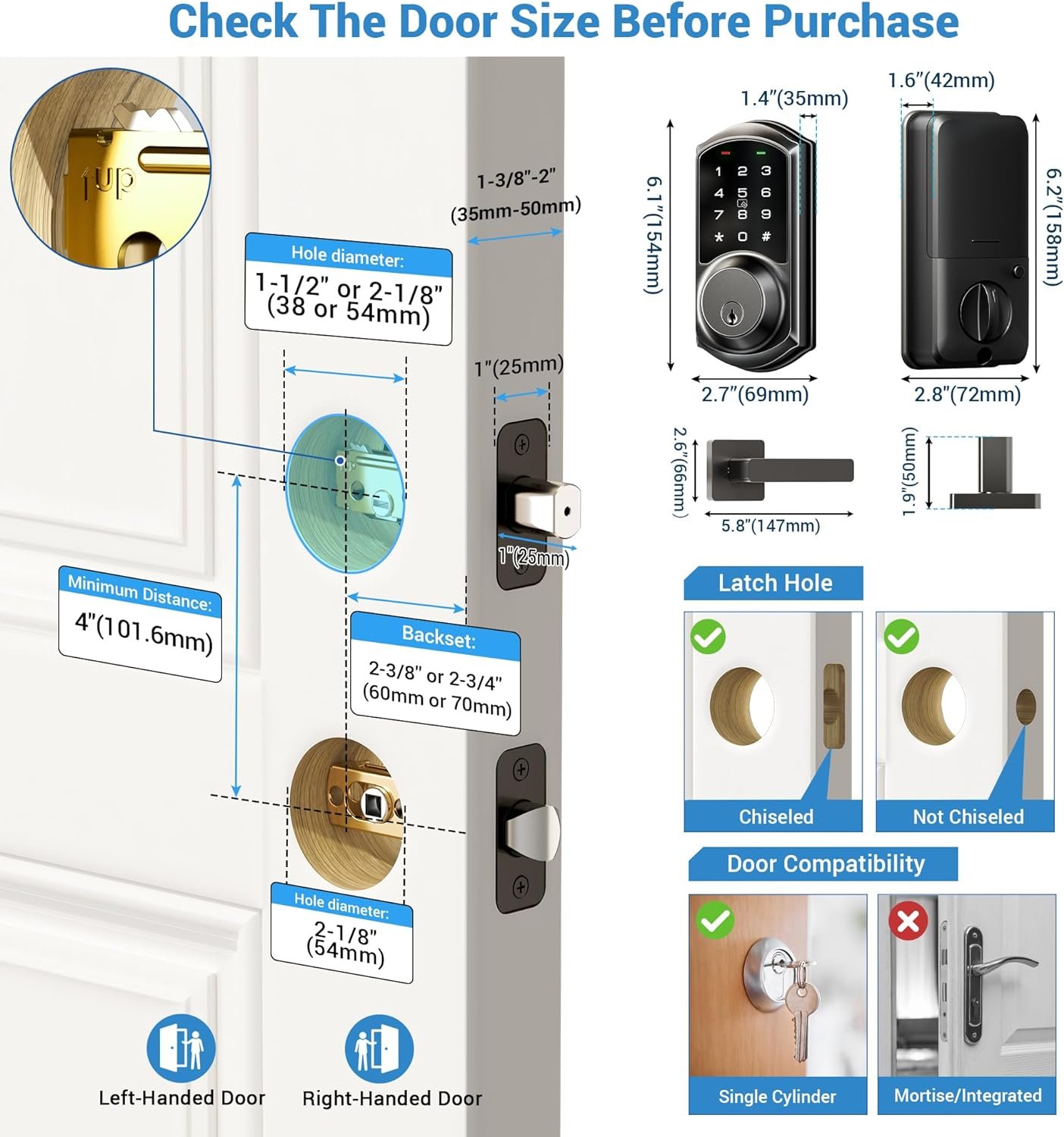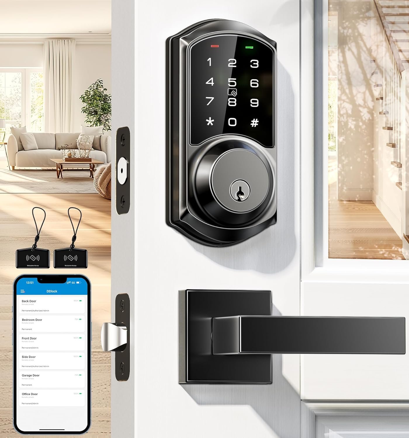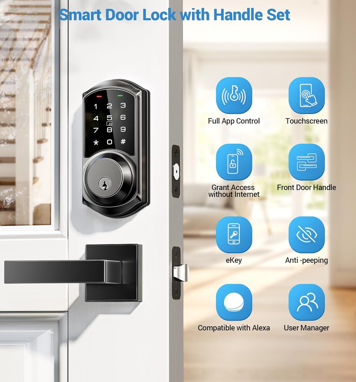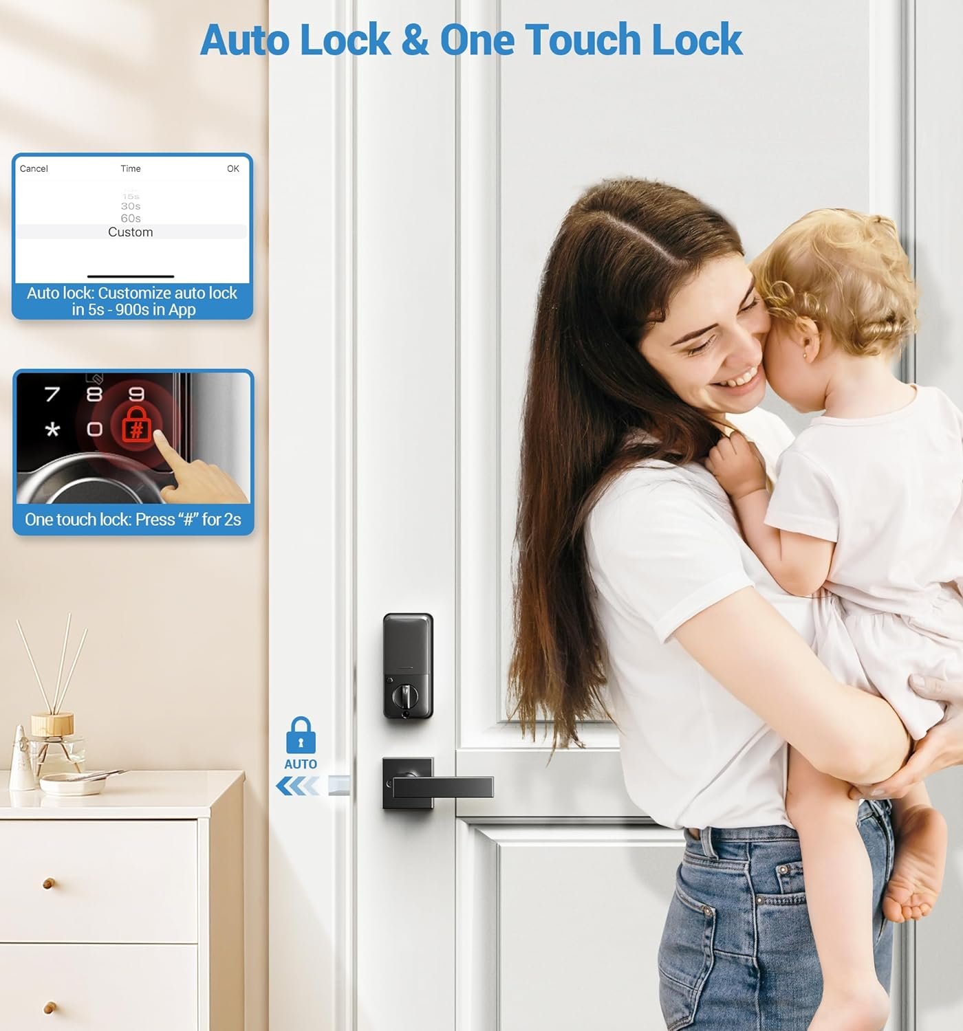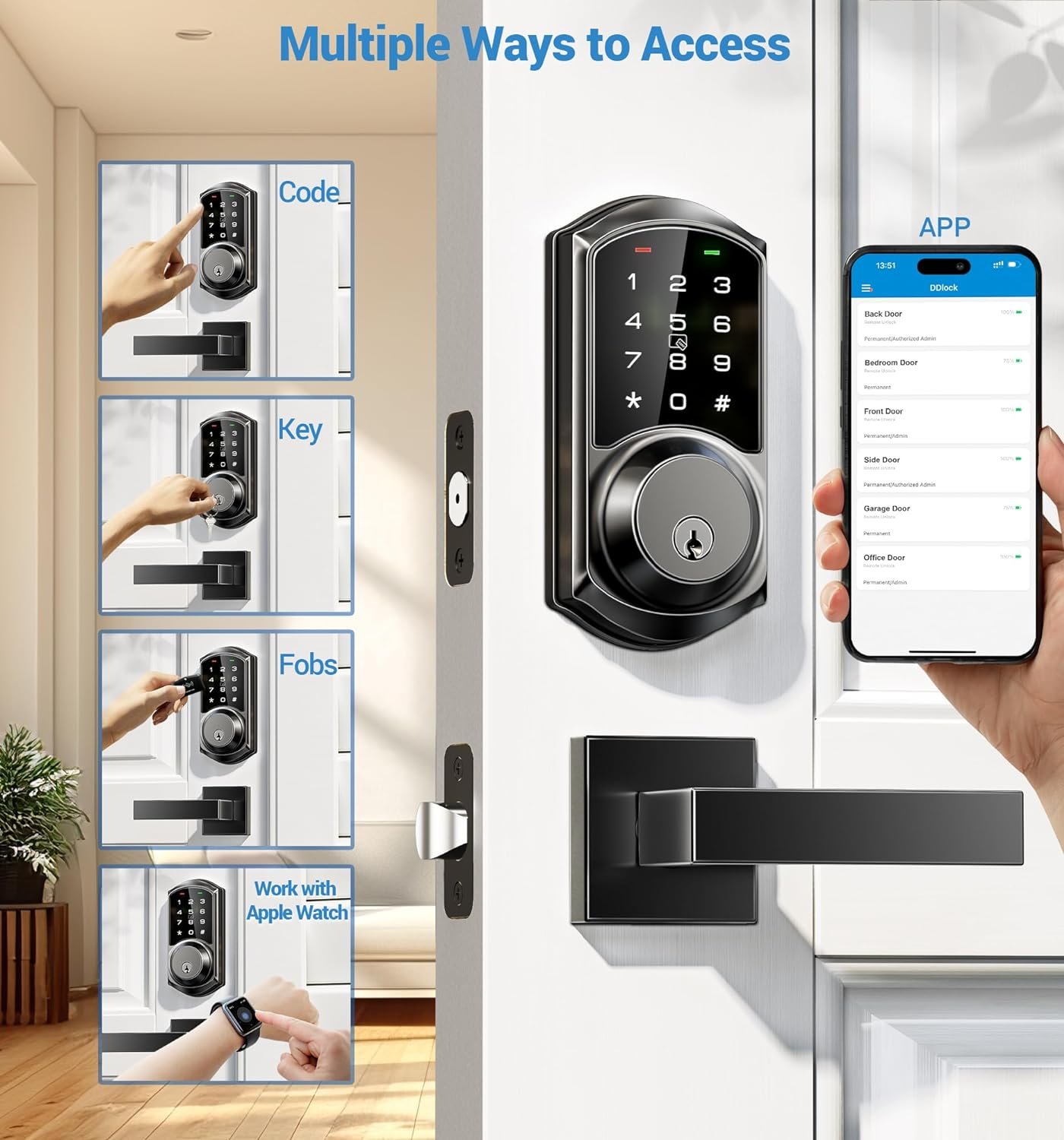 Keyless Entry Door Lock with Handle: Access your smart deadbolt lock via App + Web portal + 2 Cards + Code + eKey sharing + Authorized Admin + 2 Mechanical key + Thumb turn. AUTO lock in 5-900s and simply press “#” on the keypad for 2s to activate one-touch locking. Compatible with Apple Watch.