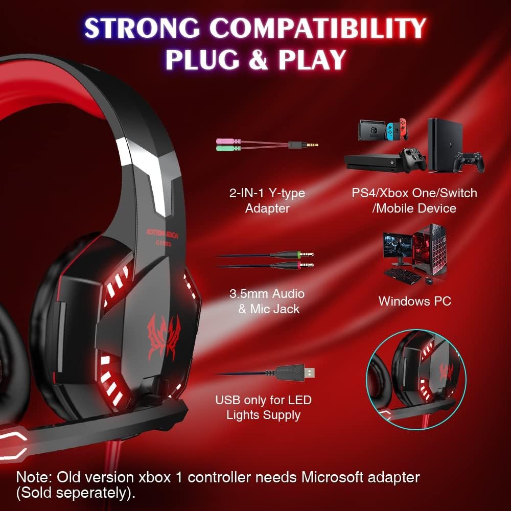 VersionTECH. G2000 Gaming Headset, Bass Surround Gaming Headphones with Noise Cancelling Mic, LED Lights, Soft Memory Earmuffs for PS5/ PS4/ Xbox One Controller/Laptop/PC/Mac/Nintendo NES Games-Red