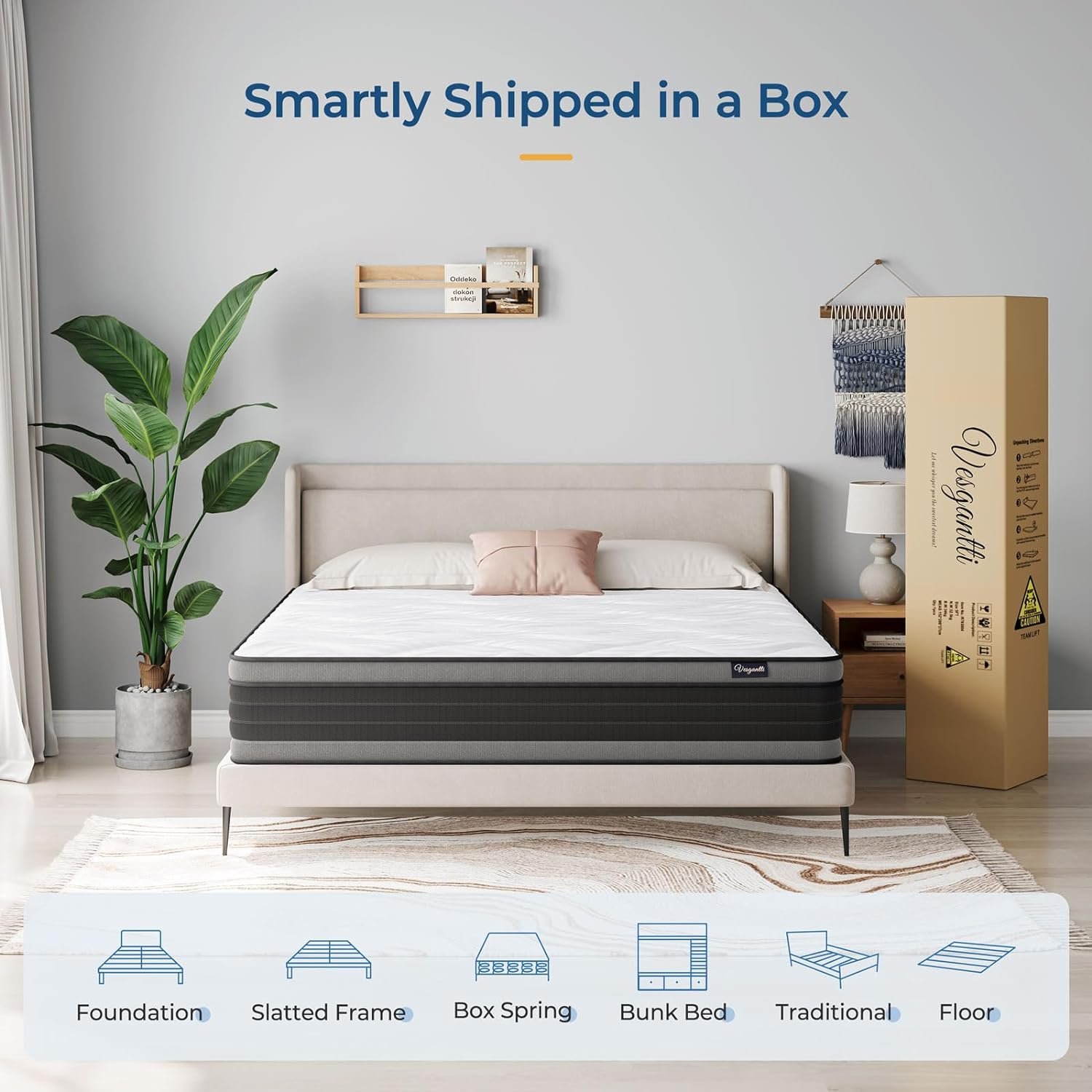 【Mattress in a Box】Vesgantti mattresses are compressed, rolled and shipped in a box, you can easily move it and set it up in your room. Note: When unwrapping the mattress, be sure to keep a safe distance, as it may expand quickly.