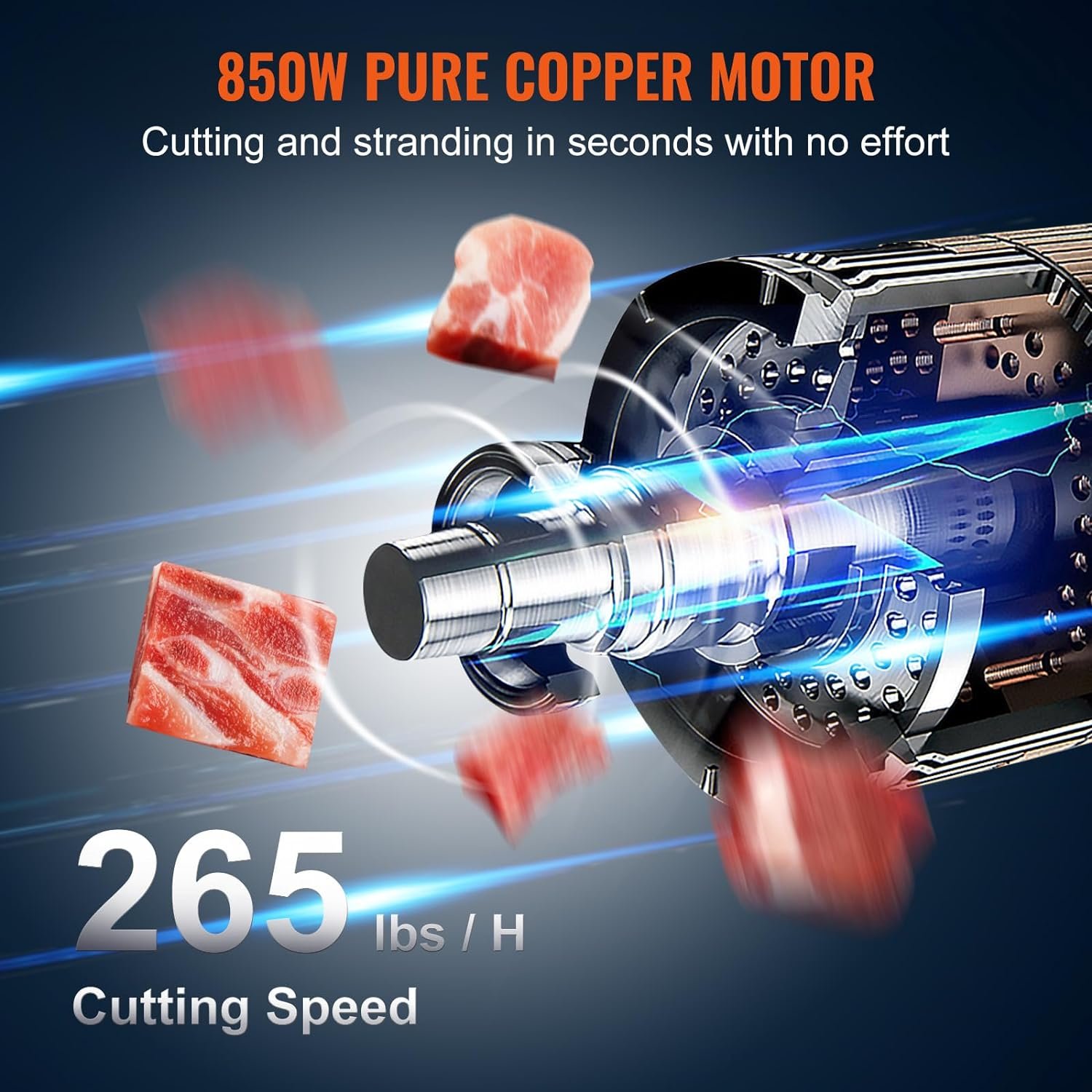 Stable & Efficient: The 850W pure copper motor provides impressive power, and the sharp stainless steel saw blade, along with precision gears, ensures a cutting efficiency of up to 265 lbs/H. Our electric bone cutting machine cuts smoothly without jamming, allowing you to easily cut various hard bones and frozen meat with a gentle push.
