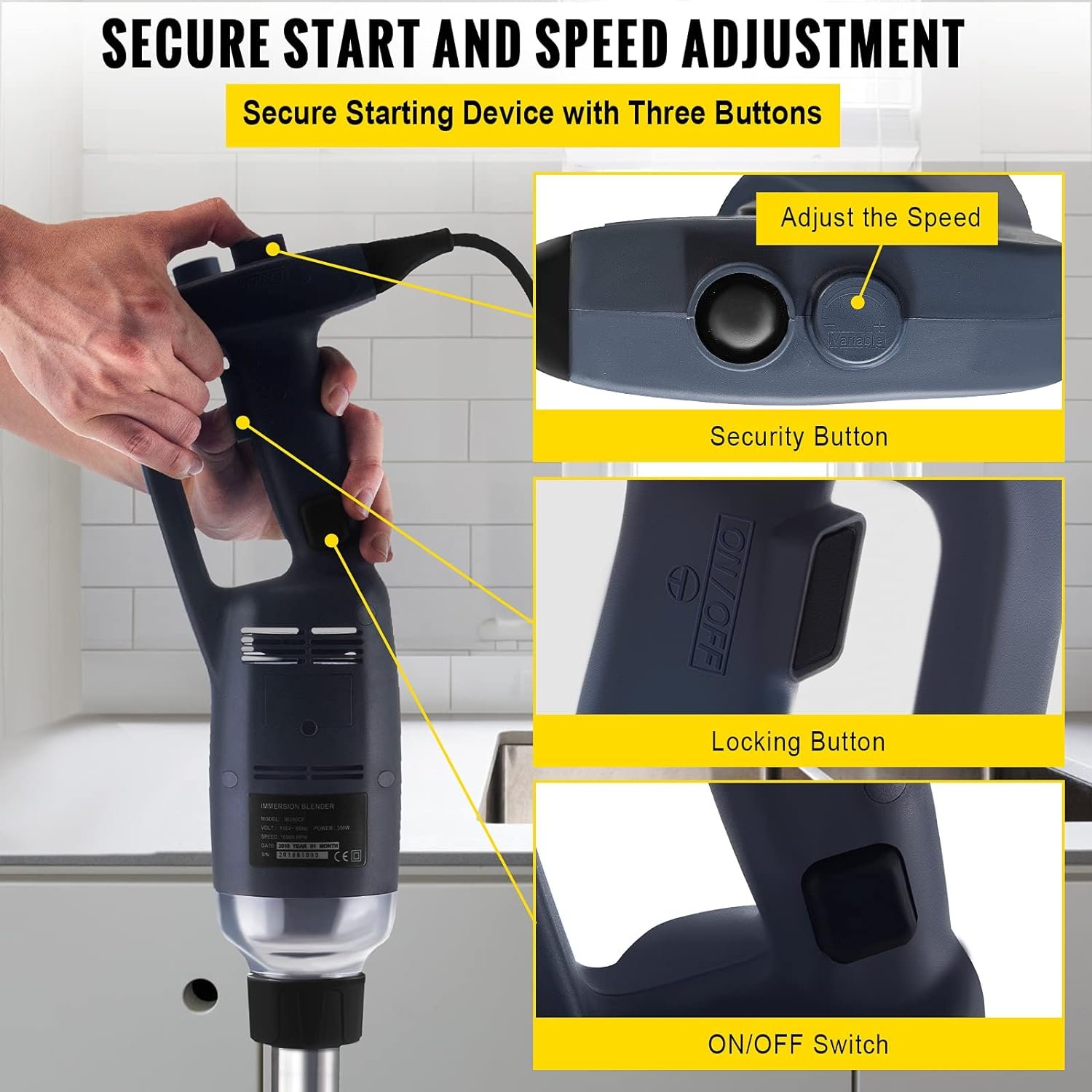 Security Start & Operate: Our heavy duty immersion blender needs to press three buttons at the same time to start, in order to avoid dangerous situations. Besides, there is a button on the top of the handle for you to adjust the speed of the blender to mix ingredients in multiple gears.