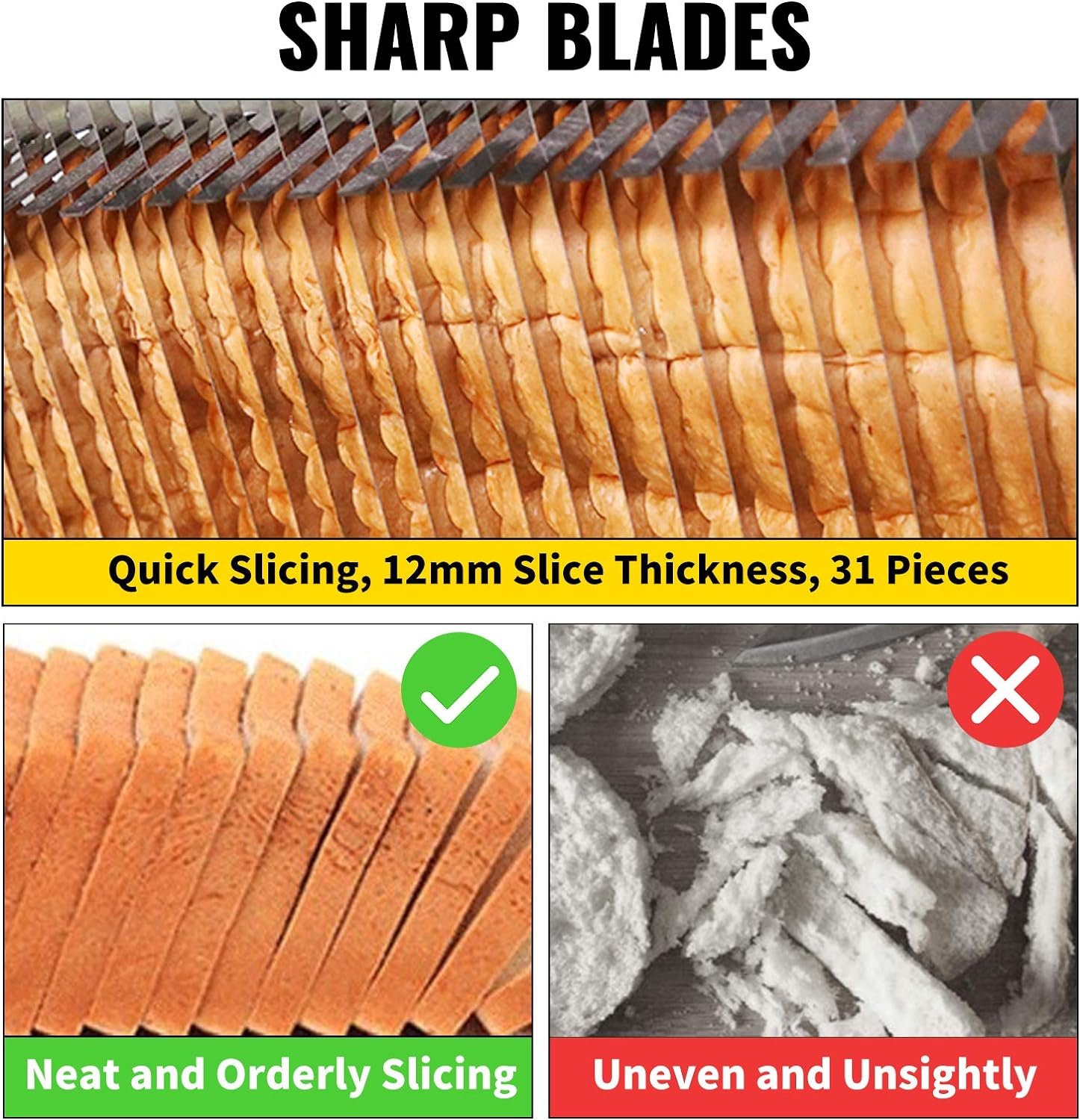 Efficient & Even Cutting: A set of sharp blades can easily and quickly slice your breads. This commercial bread slicer cutter can cut 31pcs at one time with 12 mm cutting thickness. Each slice is even and beautiful without leaving debris. 2 extra blades are included for replacement.