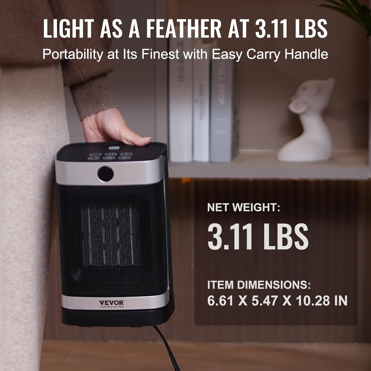 Convenient Handle: Weighing only 3.11lbs / 1.64kg, the heater has a comfortable handle at the top of the unit. Even with one hand, you can effortlessly carry it to your ideal location, allowing you to move it around your living space as needed.