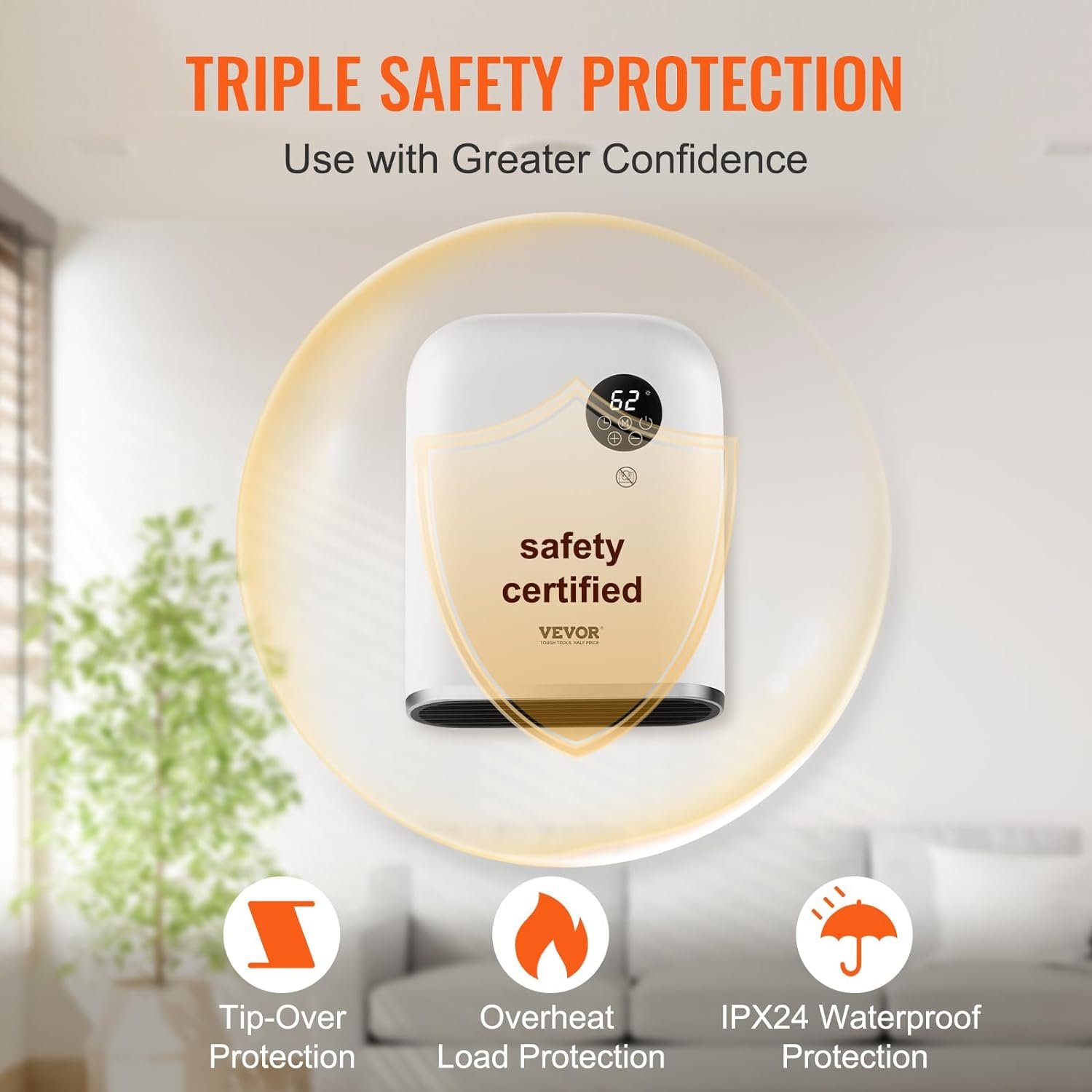 The desk heater comes with safety features including automatic power-off if tipped, overheat protection at 212°F, and IPX24 waterproofing, ensuring your safety during use.