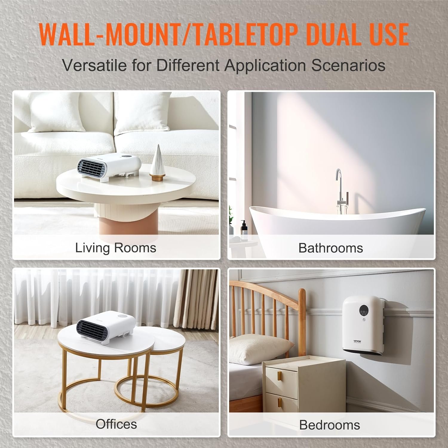 Wall-Mount/Tabletop Use: You can hang the portable heater in the living room, kitchen, or bathroom, and its compact size won’t take up much space. Alternatively, you can place it directly on tabletops in rooms like the bedroom or office.