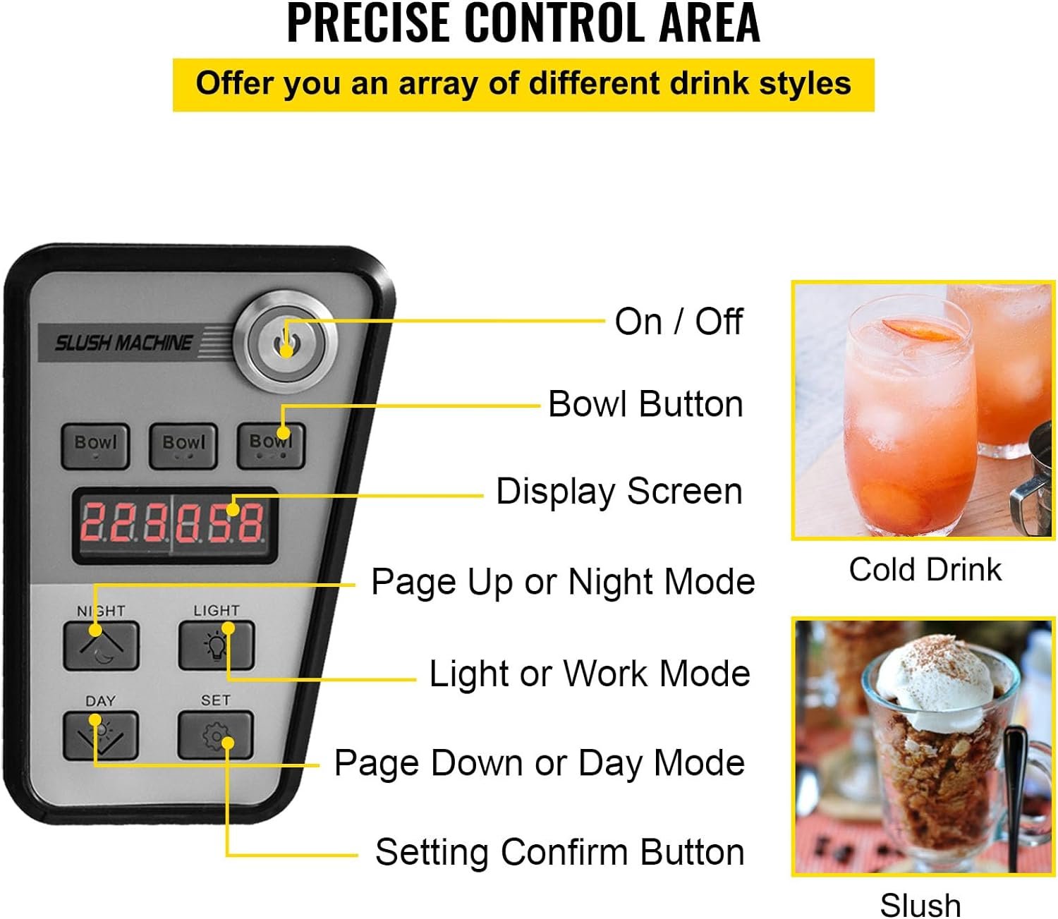 Precise Control Panel: Easy-to-use controls are intuitive and customizable enough to offer various drink styles. The slush and cold drink mode allows you to adjust the temperature and consistency until it is ideal. Each bowl operates independently from the other. A mixing switch is designed to control the 360°rotating stirrer, avoiding the sediment down to the bottom of the tank and ensuring completely mixed smoothies.