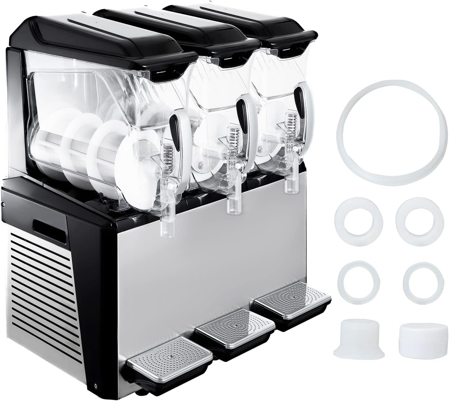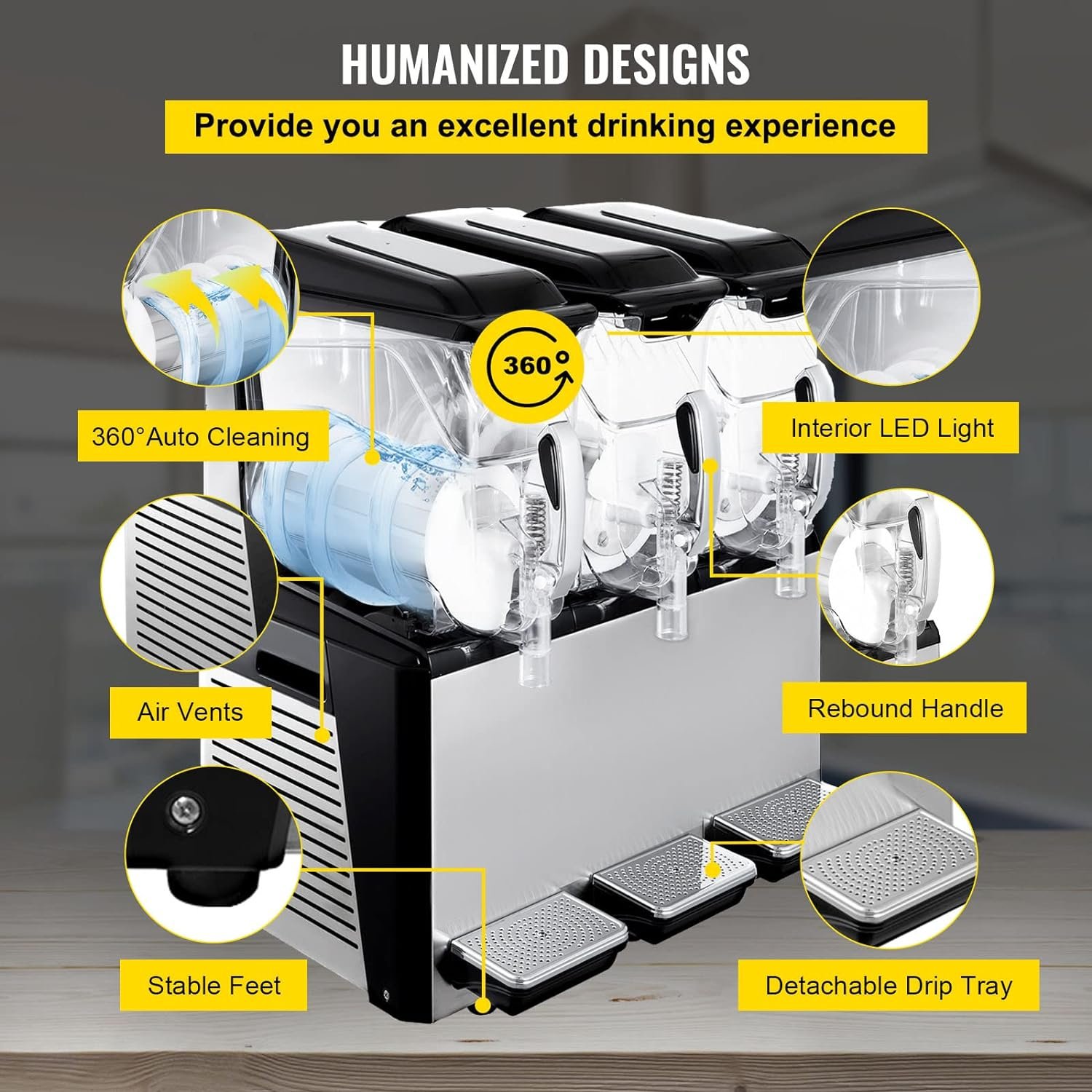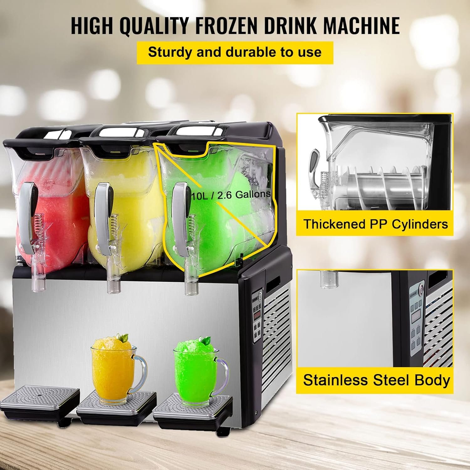 3x10L Slushy Machine: Coming with 2 large tanks with a total capacity of 30 L/ 7.8 US gallons (10 L/ 2.6 per tank), our slushy machine serves about 120 cups of delicious slushies and frozen drinks to a large number of people. 3-layer thickened stainless steel body gives long life and high performance at rust-proof, abrasion-proof. Dual food-grade PP bowls are designed with a clear, highly visible casing so your beverages can be clearly identified.