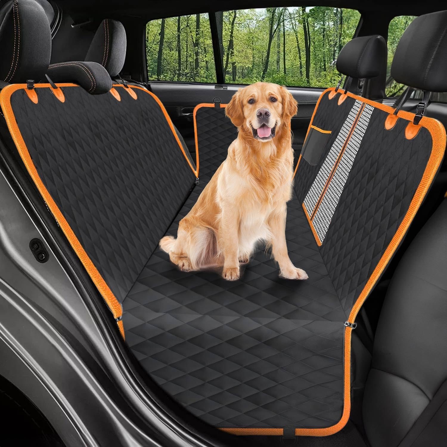 [ Mesh Window & Storage Bag & Seat Belt ] Prioritizing your pet’s comfort, our back seat cover for dogs comes with a breathable and transparent mesh window that allows you and your furry friend to see and hear each other, alleviating any stress or anxiety. The added storage bag provides ample space to store your pet’s essentials.Additional seat belt to keep your dog safer.