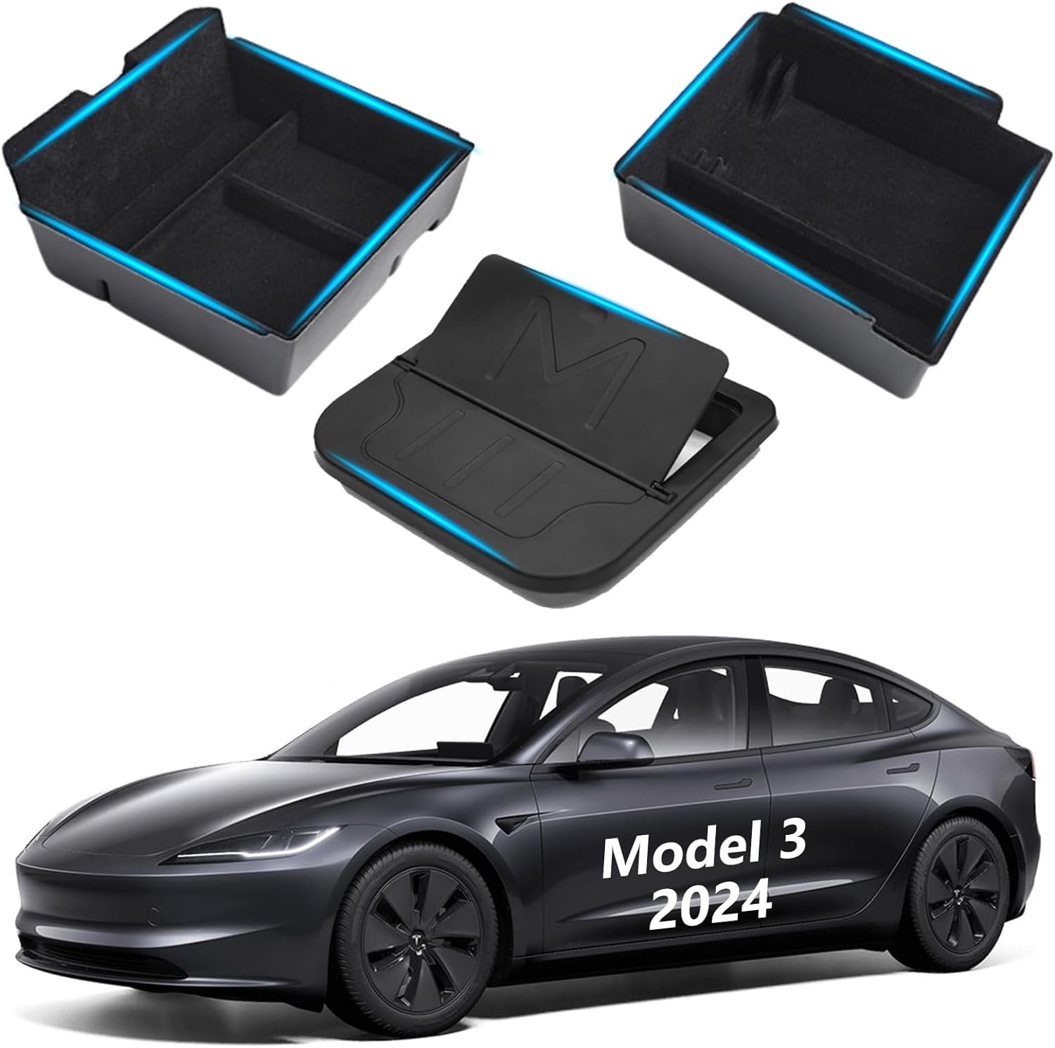 【3PCS Storage Box】Model 3 highland 2024 storage box set includes center console storage box*1, armrest storage box*1, hidden armrest storage box*1, precise size, helps to keep your car tidy.