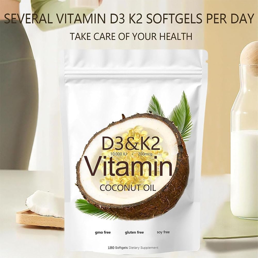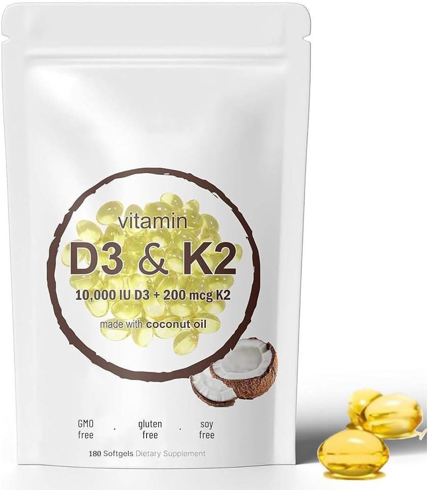 The Vitamin D3 K2 supplement offers 10,000 IU of Vitamin D3 and 200 mcg of Vitamin K2 per serving.