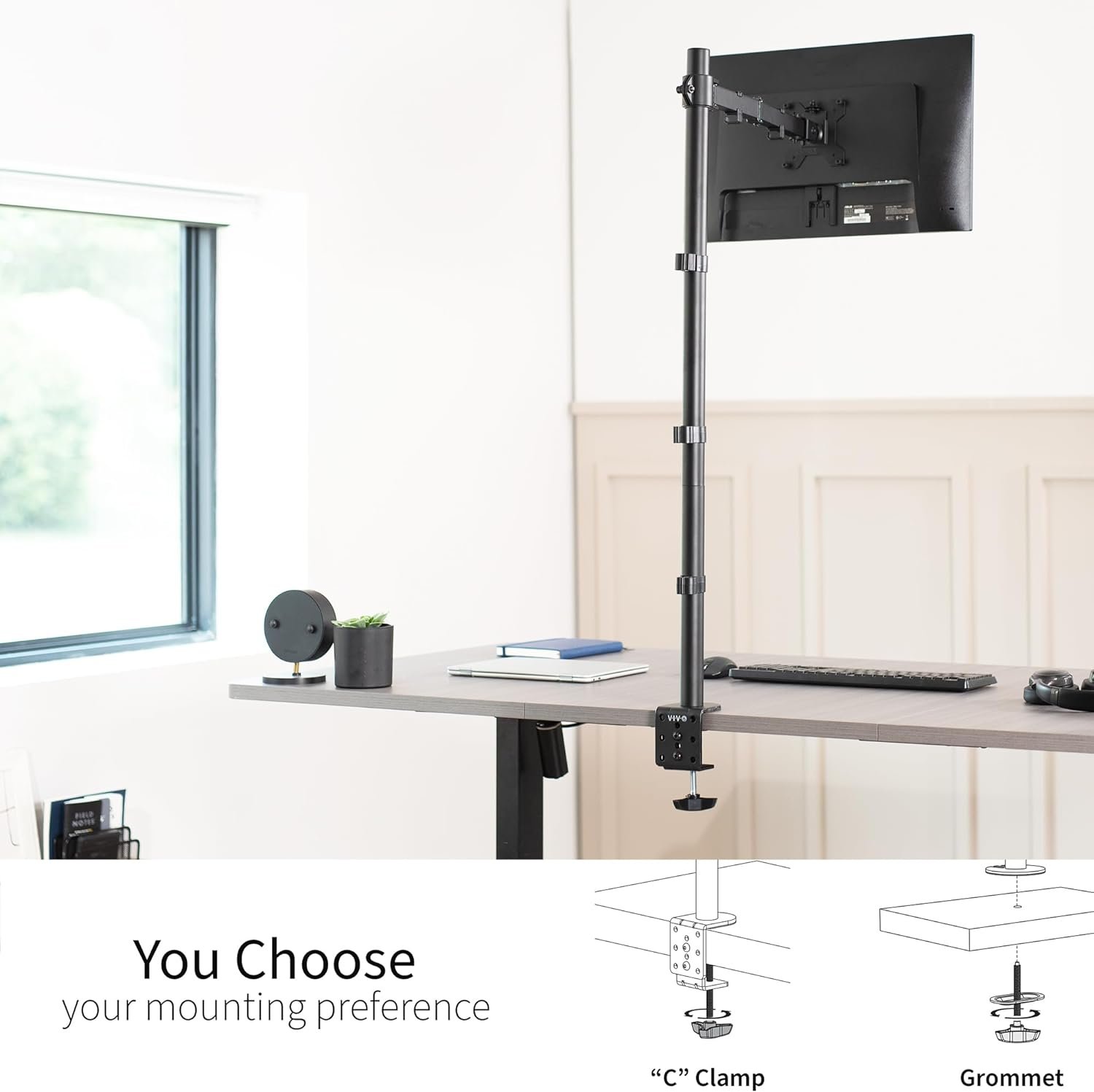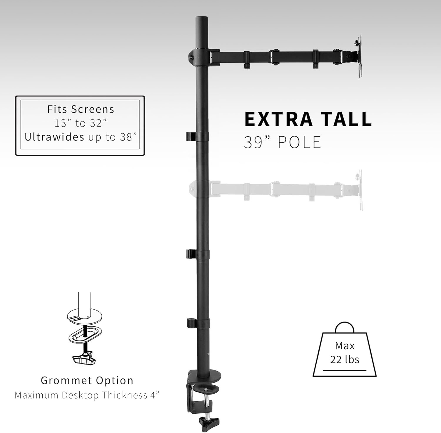 Screen Compatibility – This single-arm mount fits screens that weigh up to 22 lbs with VESA 75x75mm or 100x100mm backside mounting holes. This covers most monitors on the market between 13” and 32”, as well as ultrawide monitors up to 38”. Mounts to desks (up to 4″ thick) with heavy-duty C-clamp or optional grommet mount.