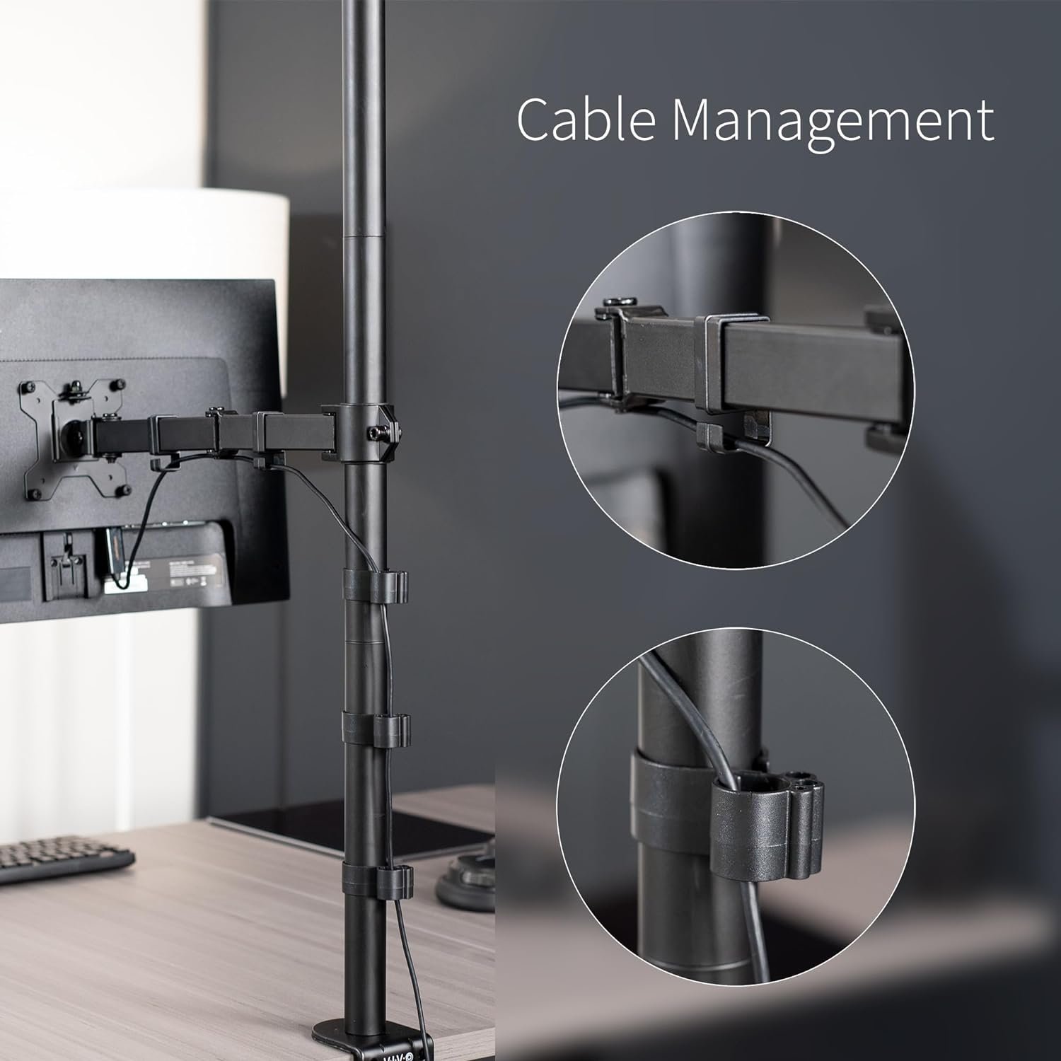 Extra Tall Pole – The 39” center pole allows you to adjust the monitor between sitting and standing positions. Integrated cable management is included to keep AV and power cords clean and organized via clips along the arm and center pole.