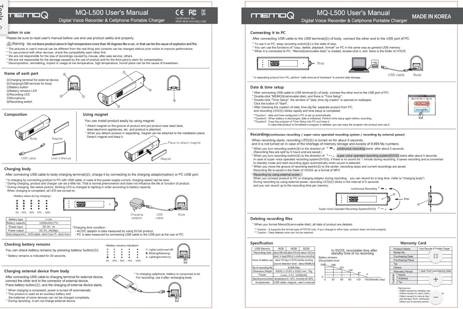 MQ-L500 has a built-in 16 GB memory which is able to store about 570 hours of recorded material.