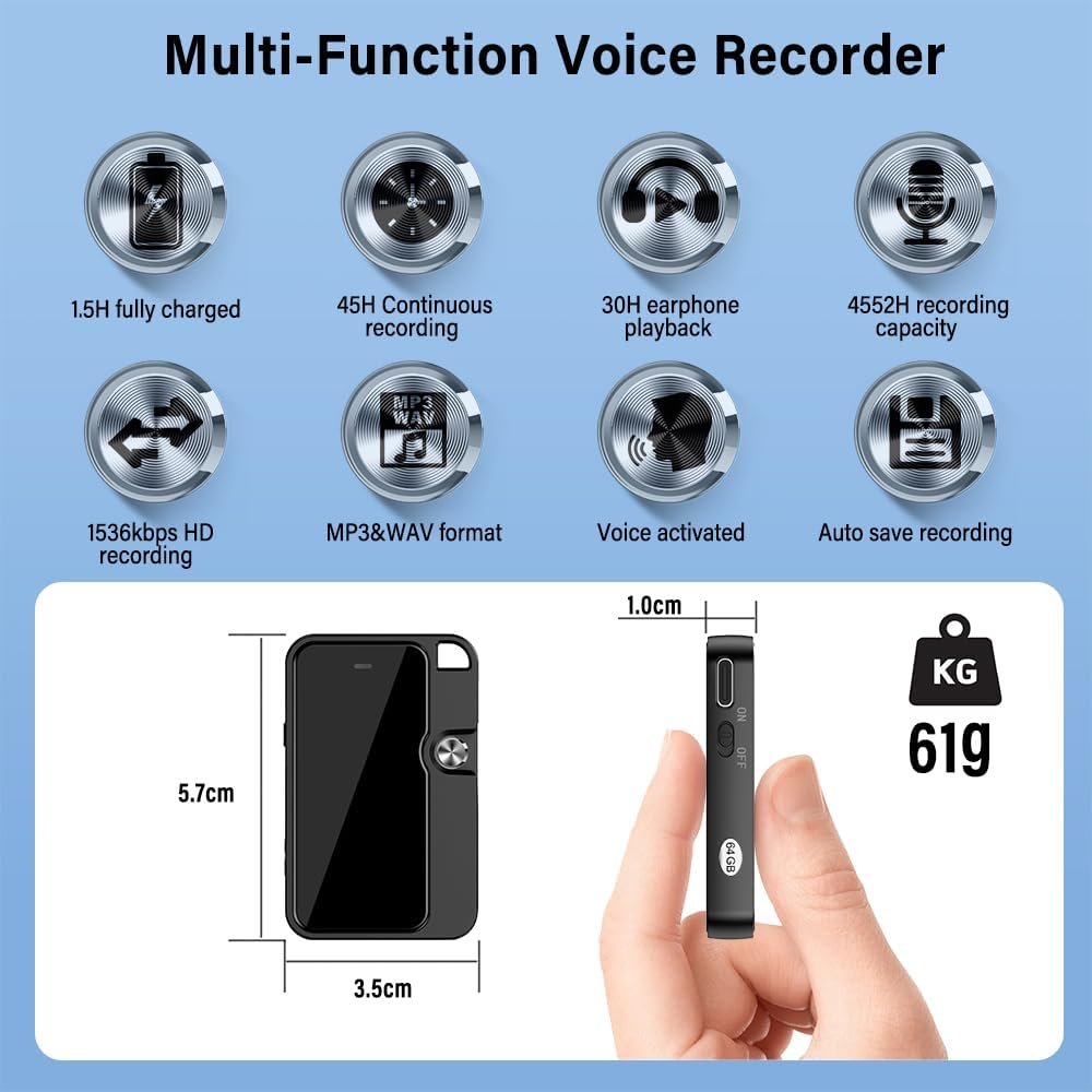 【Long Battery Life & Large Memory】-One key to record/save. Supports 45 hours long battery continuous recording time, 30 hours playback time. This recorder built in 64GB large storage(can save 4552 hours recording files). Recording will automatically saving when power low, avoid loss the important recordings, to create an intelligent experience.