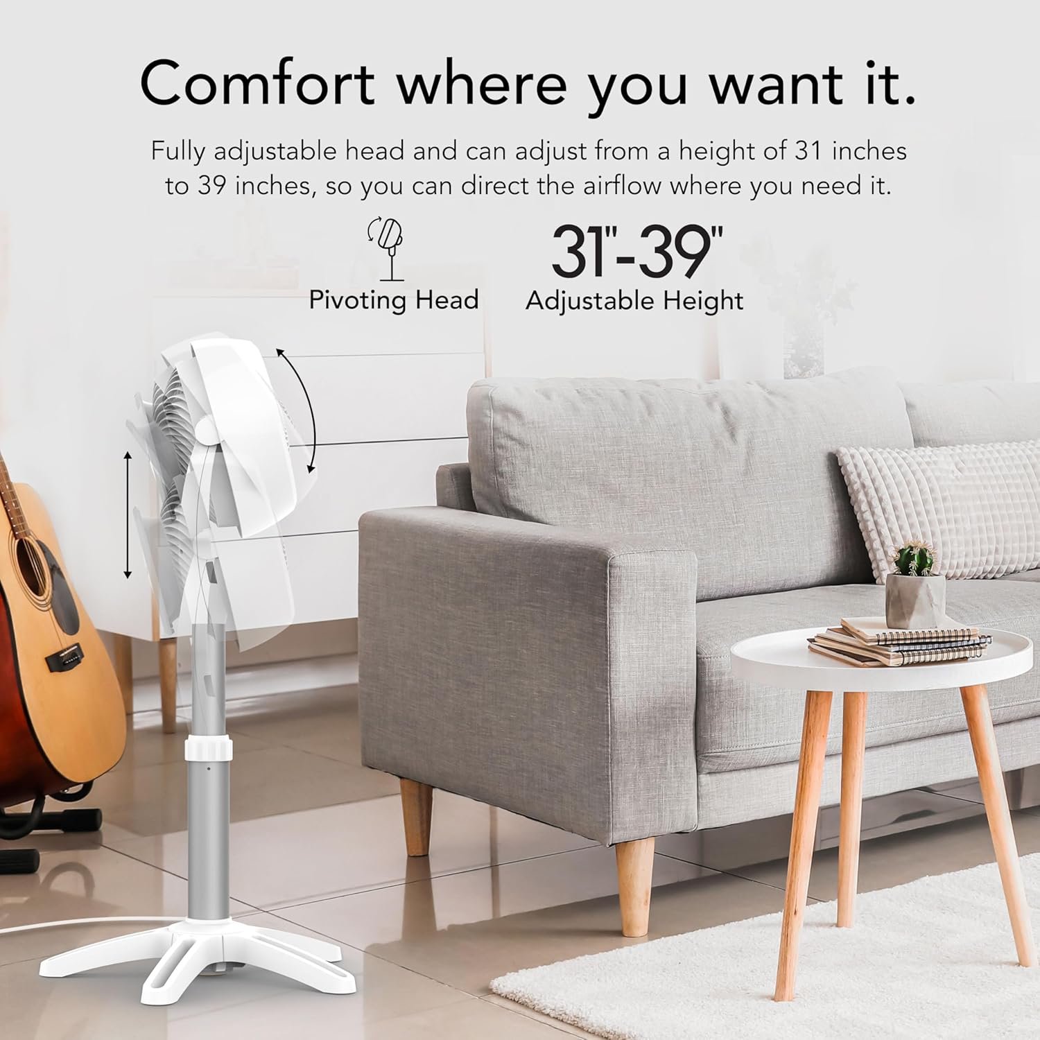 MULTI-DIRECTIONAL AIRFLOW — Equipped with a pivoting head and adjustable height (31” to 39”) to direct the air where you need it. The base is easy to assemble, no tools required.
