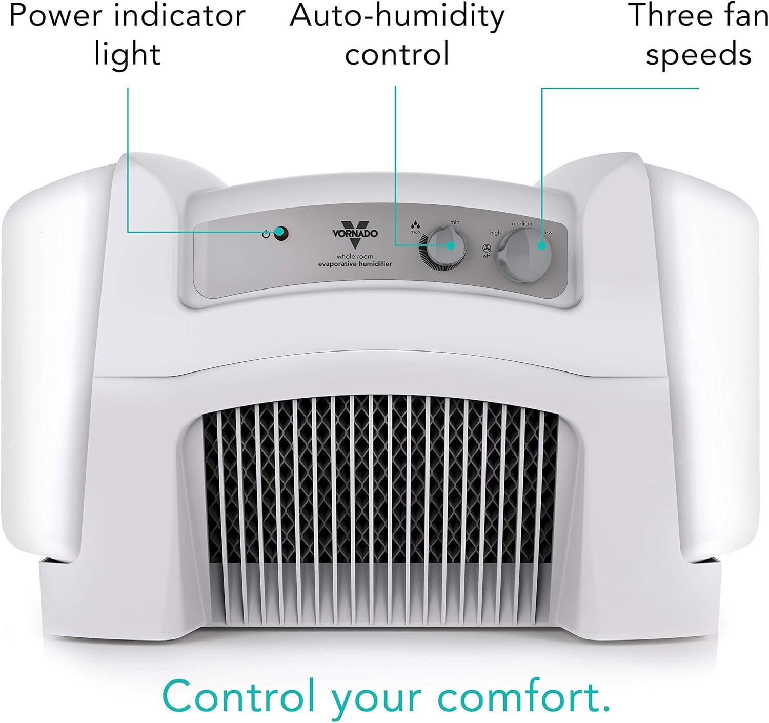 SIMPLE CONTROLS — Control panel allows you to select your fan speed (low/750 RPM, medium/1150 RPM, or high/1600 RPM) and your desired humidity level using the humidistat dial.