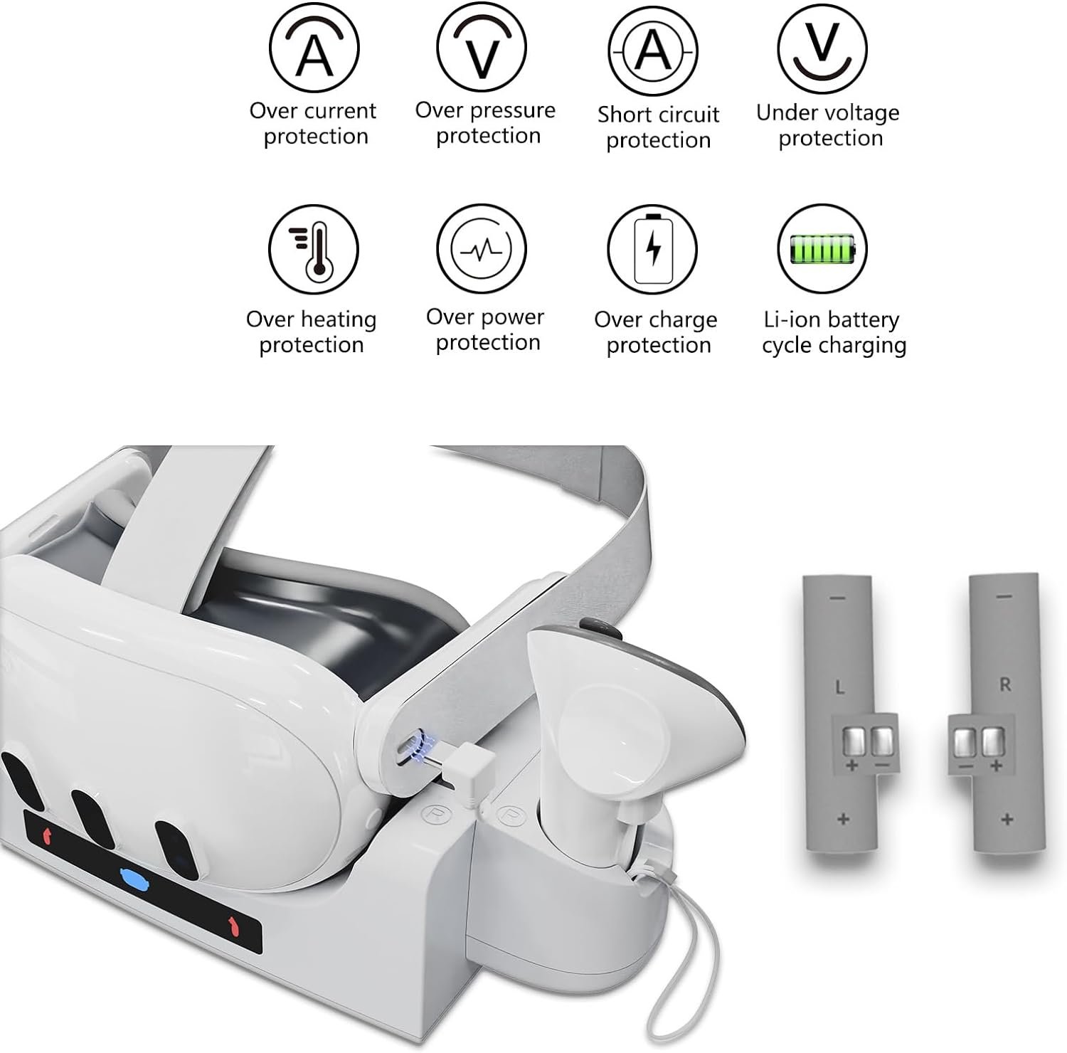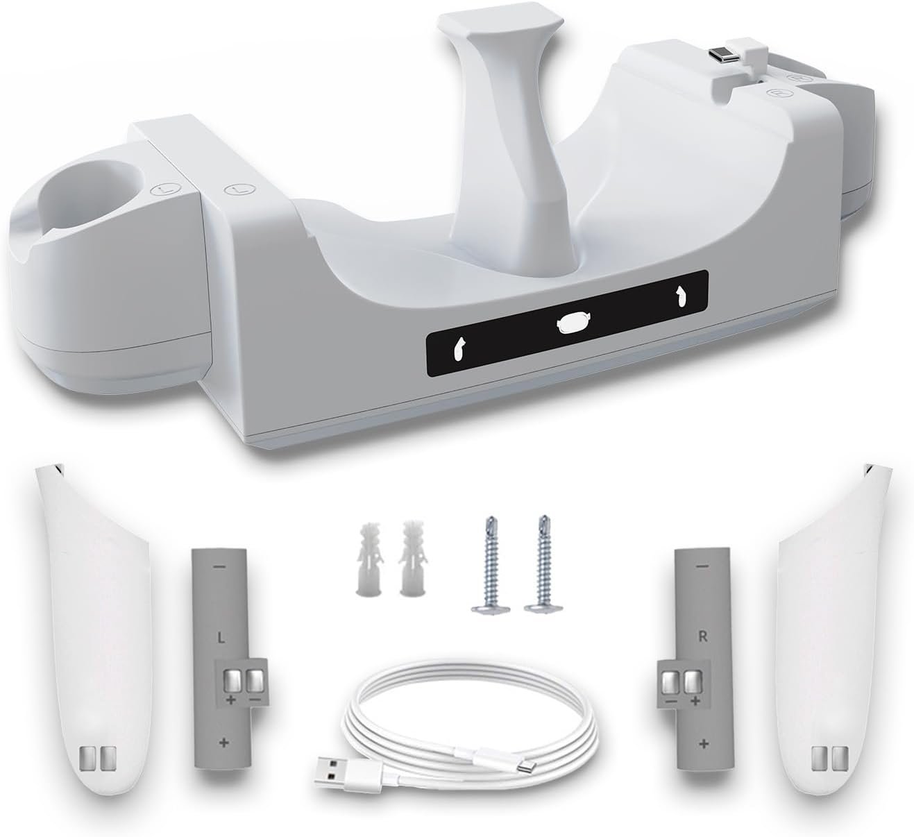 [LED Indicator]:The VR charging dock is designed with LED indicators to show the charging status of the headset and Touch controller. Headset light is blue when not loaded or fully charged, red when charging,Both controller lights are green when not loaded or fully charged and red when charging, letting you know when the headset and controller are fully charged and ready for further use.
