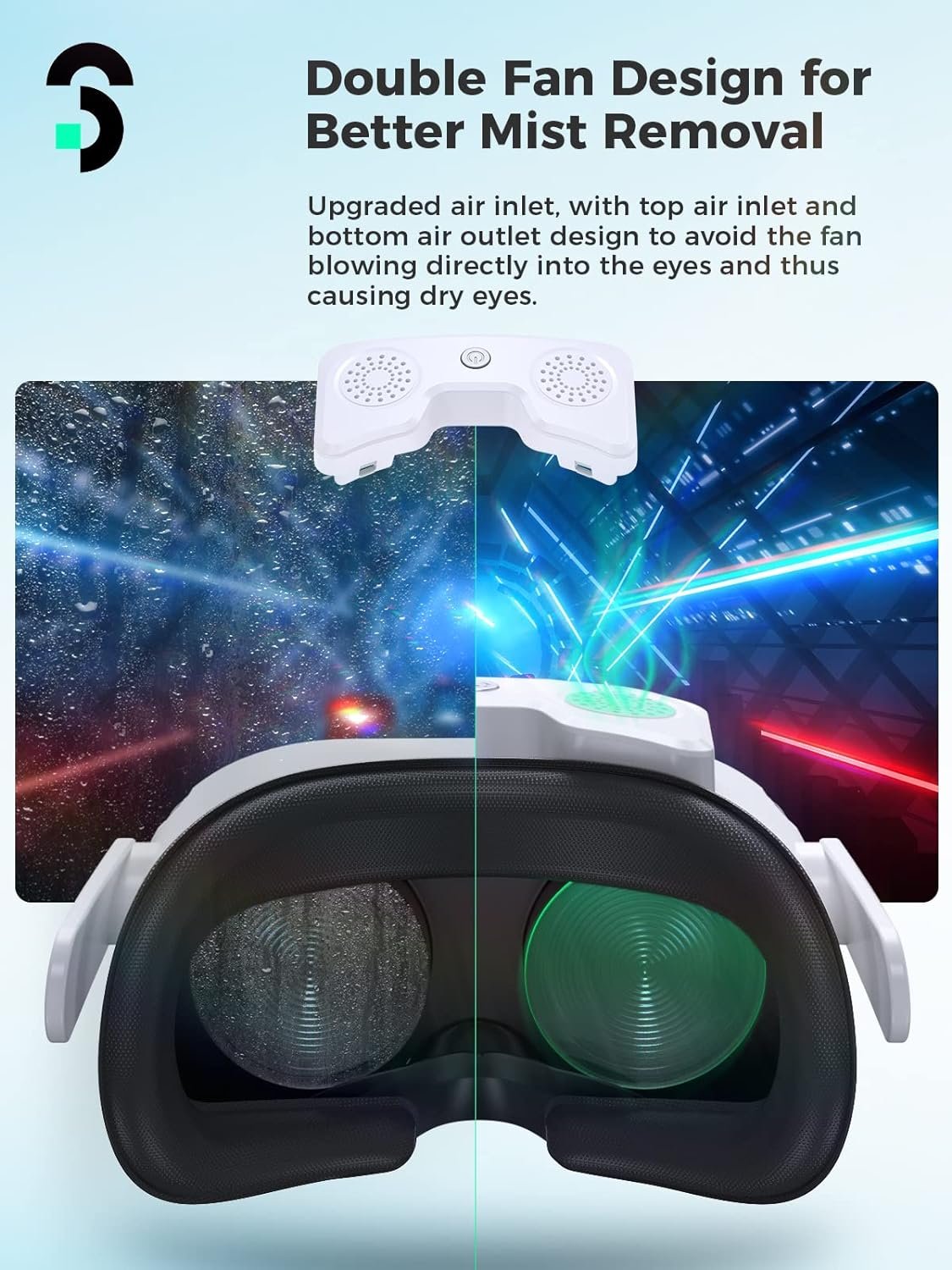 Dual Cooling Fan System, No More Fogging: The double cooling fan system blows air from two air ducts through two fans, which is more efficient, more powerful and quieter than a single fan system. Upgrade the air inlet to avoid the fan blowing directly on your eyes, which will not dry out your eyes. The top air inlet design and the bottom air outlet design make use of the air inlet to improve the facial air circulation and enhance the comfort of wearing.