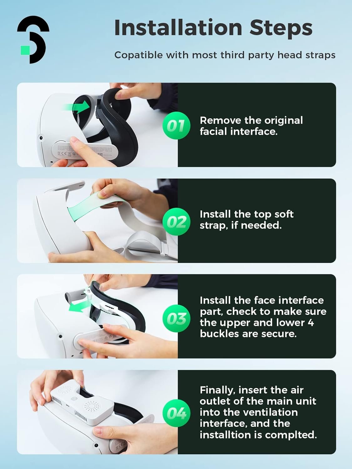 Easy to Use: Snap-on design, easy to install and remove. Once installed, the facial interface is stronger than the official one and less likely to fall off. The cooling fan compatible with Oculus Quest 2 distributes facial pressure to the forehead and is lightweight for your facial comfort. Suitable for all types of headbands, including Elite and other head straps.