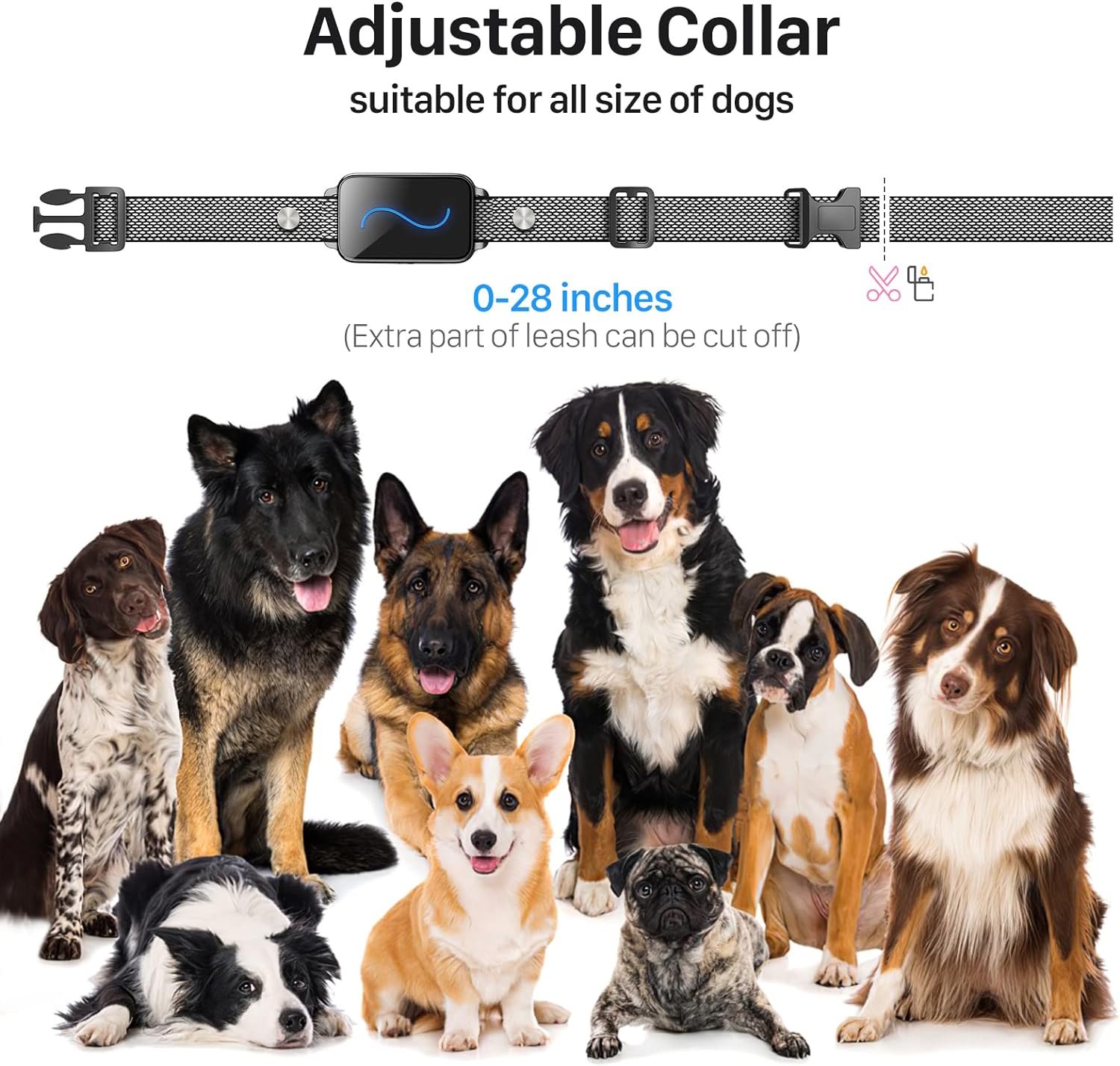 Adjustable dog training collar, suitable for All Sizes of Dogs: the leash is 28 inches long , and it can be cut off as needed. Perfect for all size dogs (8 lbs~120 lbs), even puppies fit perfectly.