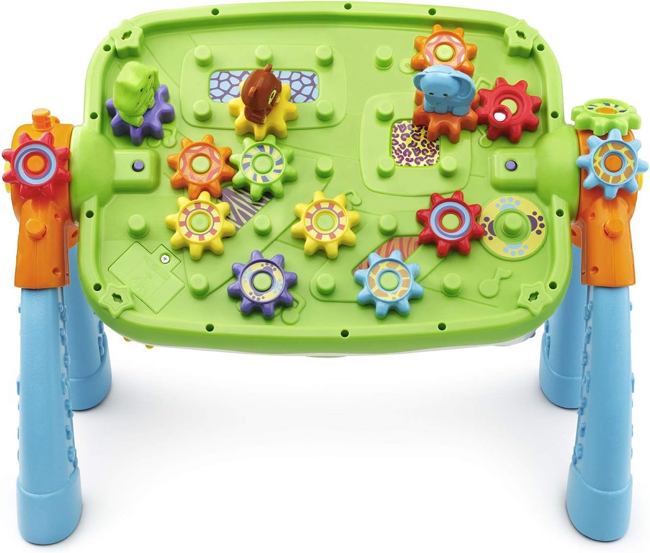 Turn the table over and connect the 16 gears for mix and match creative play. Activity center is intended for ages 18 months to 4 years; 2 AA batteries are included for demo, use new batteries for regular use