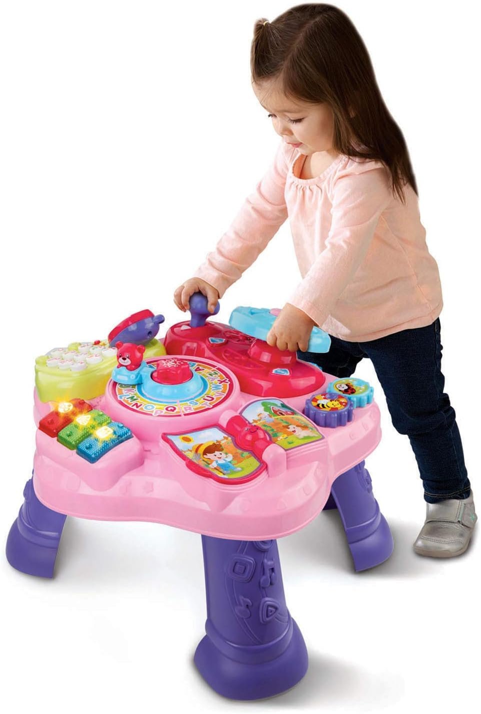 The magic Star learning table features six fun activities in English and Spanish that encourage your child to explore and learn. Turn the steering wheel to drive the bear around the activity table, flip the book page to hear Nursery rhymes and turn the gears to strengthen fine motor skills. Press the light-up music buttons to play music and learn about colors. Then, pick up the pretend phone and press the number buttons to call animal friends. Remove the legs, and the table can also be used as a floor play toy.