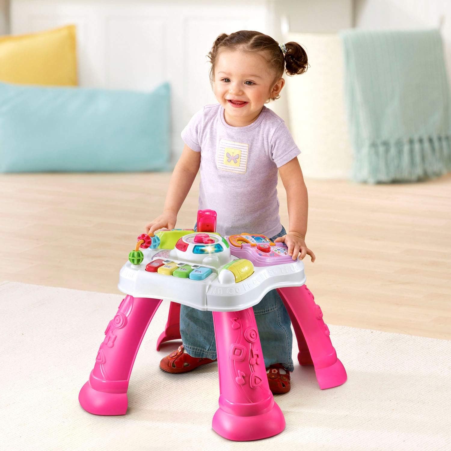 The Sit-to-Stand Learn and Discover Table grows with your baby, transforming from a floor toy into a two-way learning table