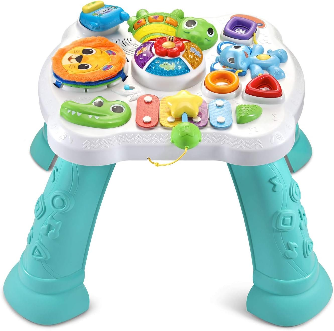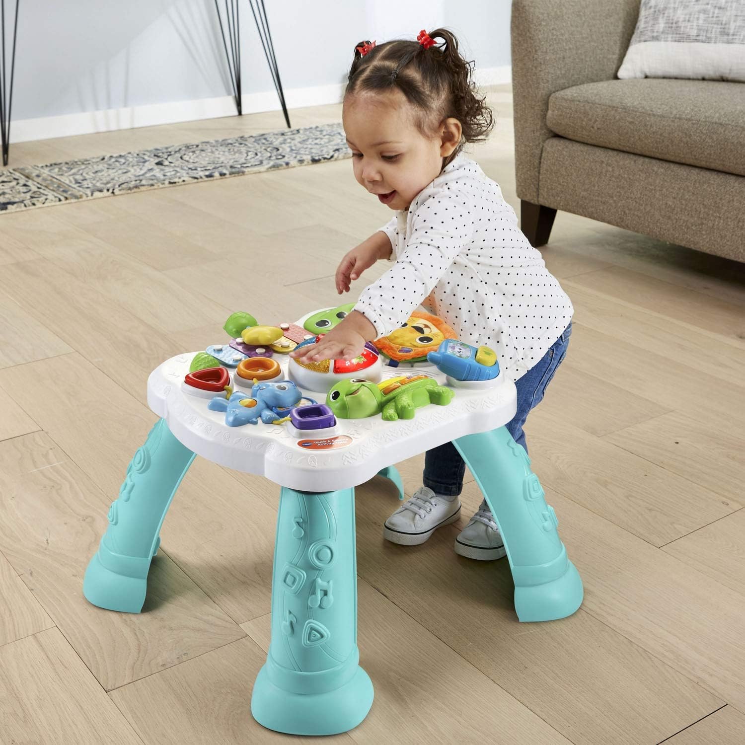 Sit-to-stand activity table starts with floor play; add removable table legs when kids can stand on their own; six play zones enhance discovery