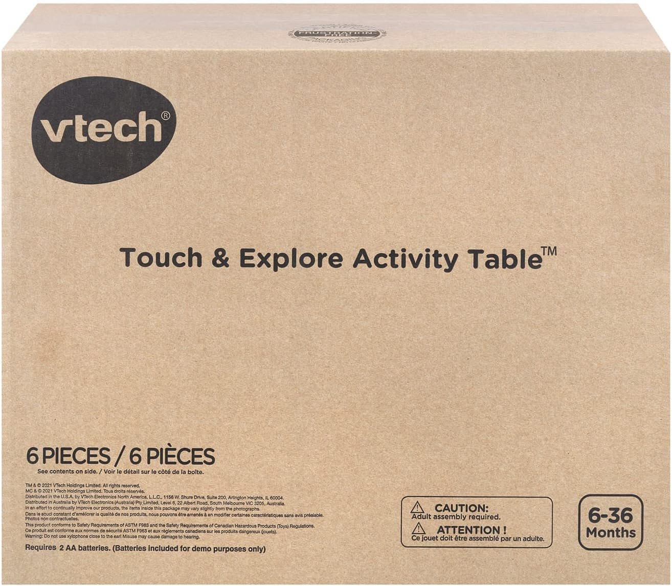 Discover six sensory play zones with the sit-to-stand Touch and Explore Activity Table™! Start with floor play, then switch to table play when your child can stand on their own. Activities on the interactive tabletop introduce kids to animals, colors and numbers with 90+ songs, melodies, sounds and phrases. Touch, press and spin to practice fine motor skills. An alligator xylophone helps inspire a love of music and includes an attached mallet. Spin the flower dial to the lion, elephant, turtle and alligator to hear animal fun facts, sounds and music. Stimulate your child’s sense of touch with the soft lion’s mane, bumpy-shelled turtle and the soft, crinkly pages of the fabric book. Three shape sorters help children learn to recognize circle, square and triangle shapes. A detachable play phone helps inspire imaginative play. It’s time to explore and so much more! Includes four removable table legs. Intended for ages 6–36 months. Requires 2 AA batteries. Batteries included for demo purposes only. New batteries recommended for regular use.