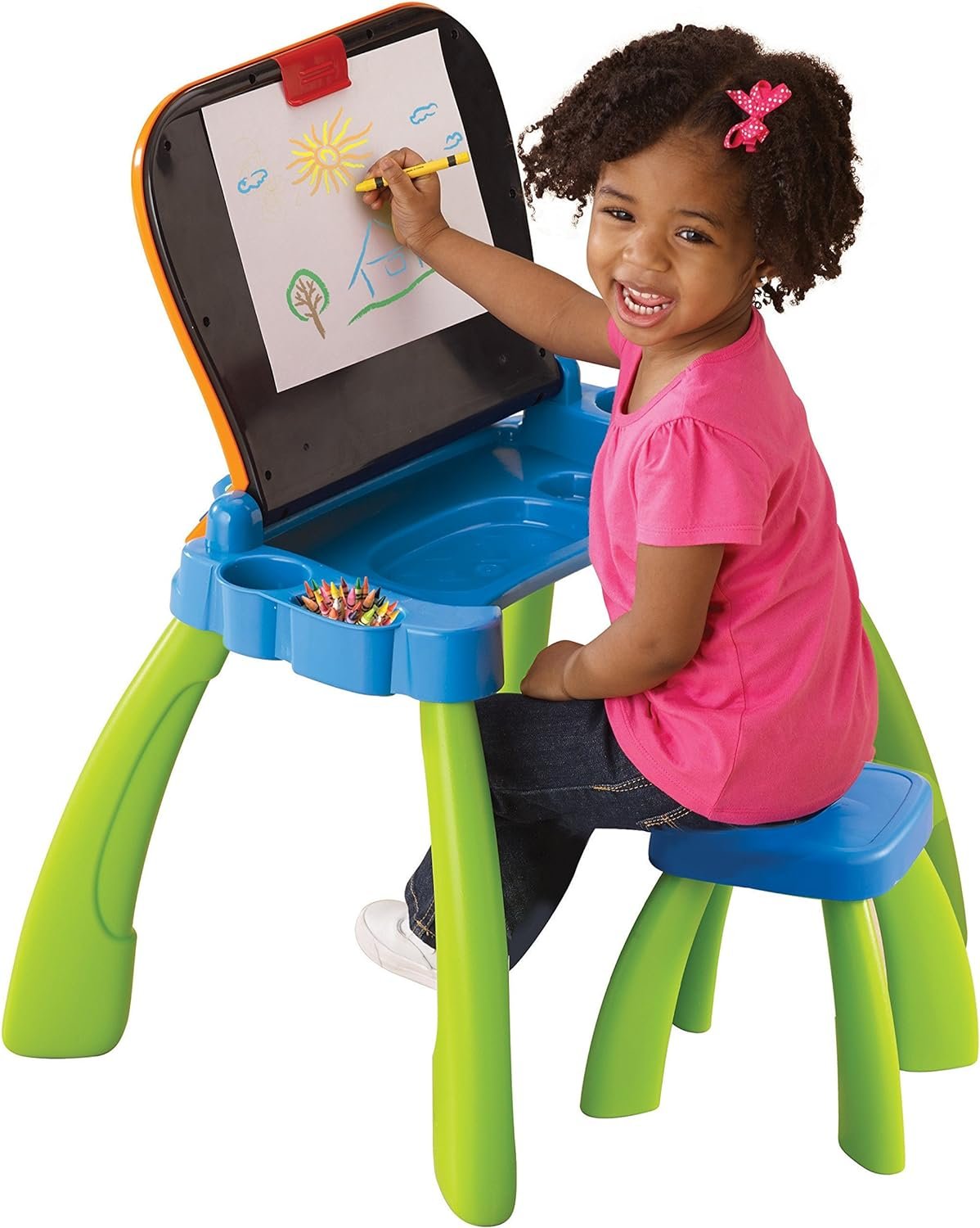 Activity table comes with an interactive LED screen that demos how to write letters and numbers step by step; stool is included with kids desk