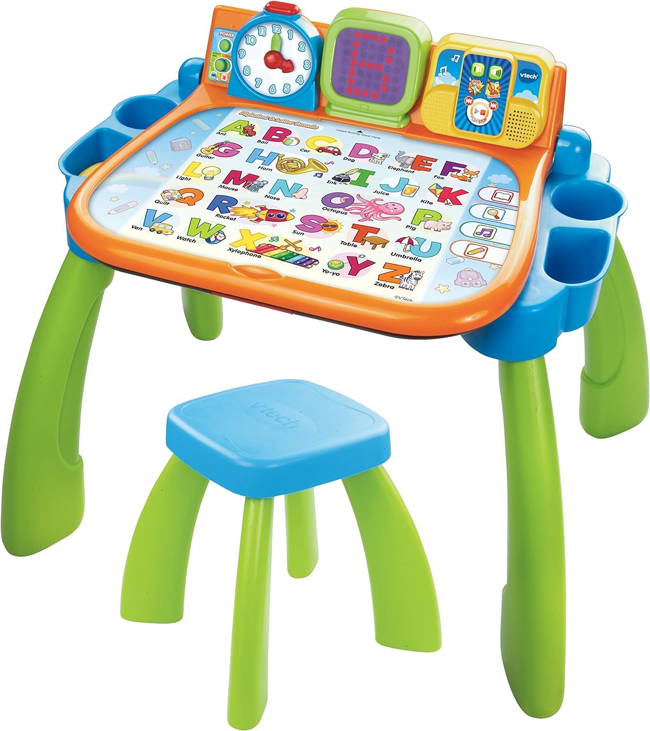 Learn and create with the touch & learn activity desk by VTech. The desk features an interactive Desktop and four double-sided cards that introduce numbers, letters, animals, people and more. Flip up the Desktop and create a masterpiece using the easel or chalkboard.